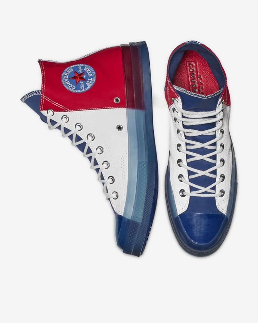 细心的朋友可能会发现,这双红白蓝三色拼接 Converse 已经凭借颜值带动市场价格。