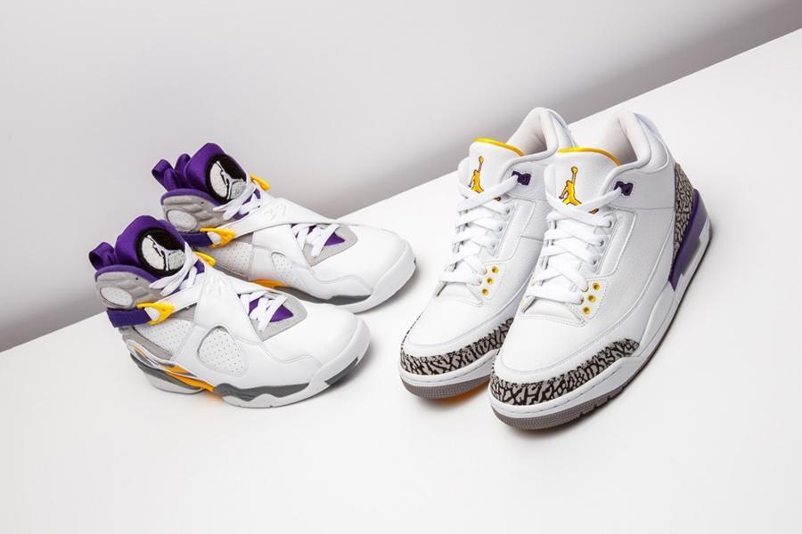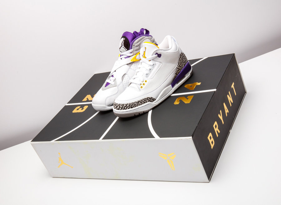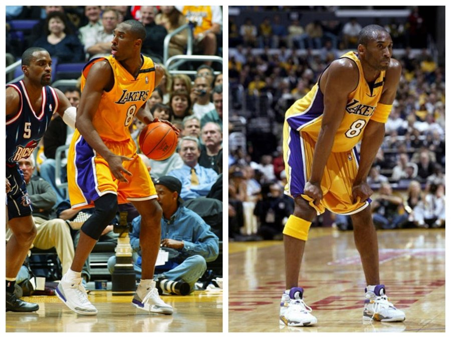 当年科比在离开 adidas 后,经历了很长一段时间的乱穿鞋时期,上脚过很多经典鞋款,其中就包括了湖人配色的 Air Jordan 3 和 Air Jordan 8。