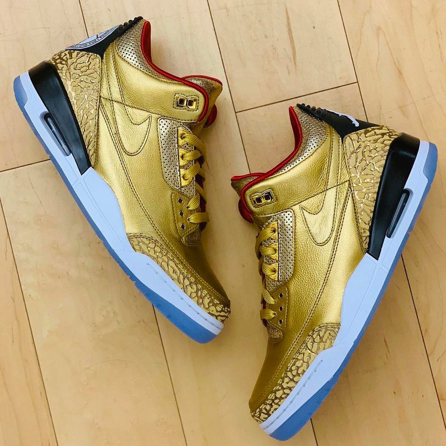 第 91 界奥斯卡颁奖典礼已经在北京时间今天上午隆重举行,昨天斯派克李晒出了 Jordan Brand 为他打造的奥斯卡专属鞋款。 今天斯派克李就穿上了这双金光灿灿的奢华版个人专属配色,搭配一身紫色西装看起来格外吸睛醒目。 这款金装加持的 Air Jordan 3 JTH 采用了带有钩子的全新设计,除了金色的皮革鞋面,后跟带有斯派克李的公司 LOGO,都是它独特的视觉元素。 颇有小金人的华丽感受,斯派克李也将亲自上脚,出席即将开幕的颁奖典礼。