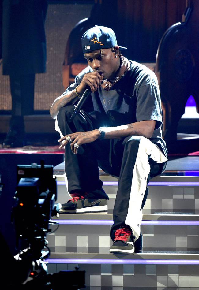 同时备受关注的跨界联名设计师 Travis Scott,也在格兰美的舞台中,上脚了自己联名打造的 Air Jordan 1 Low。