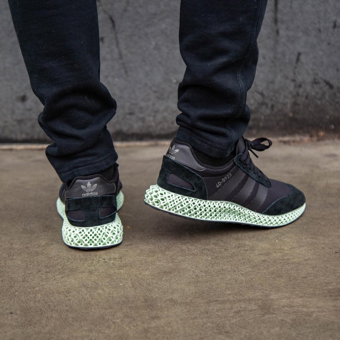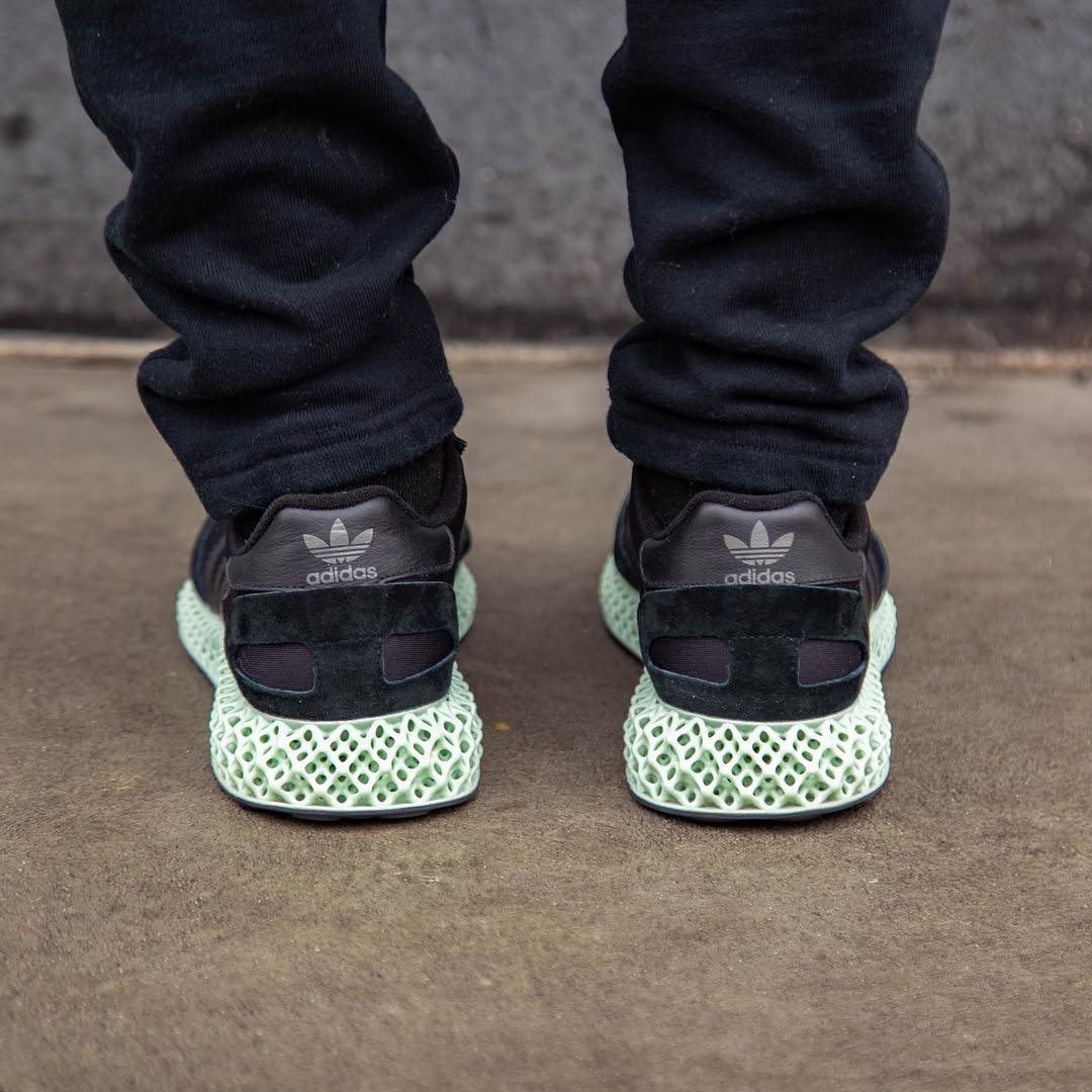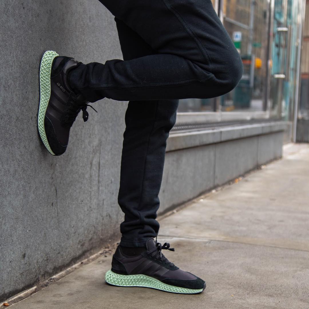 鞋身以极其经典的 adidas 复古鞋款 I-5923 为灵感,黑色的皮质鞋身与淡绿色的 4D 鞋底相结合,将未来科技与经典造型融合。