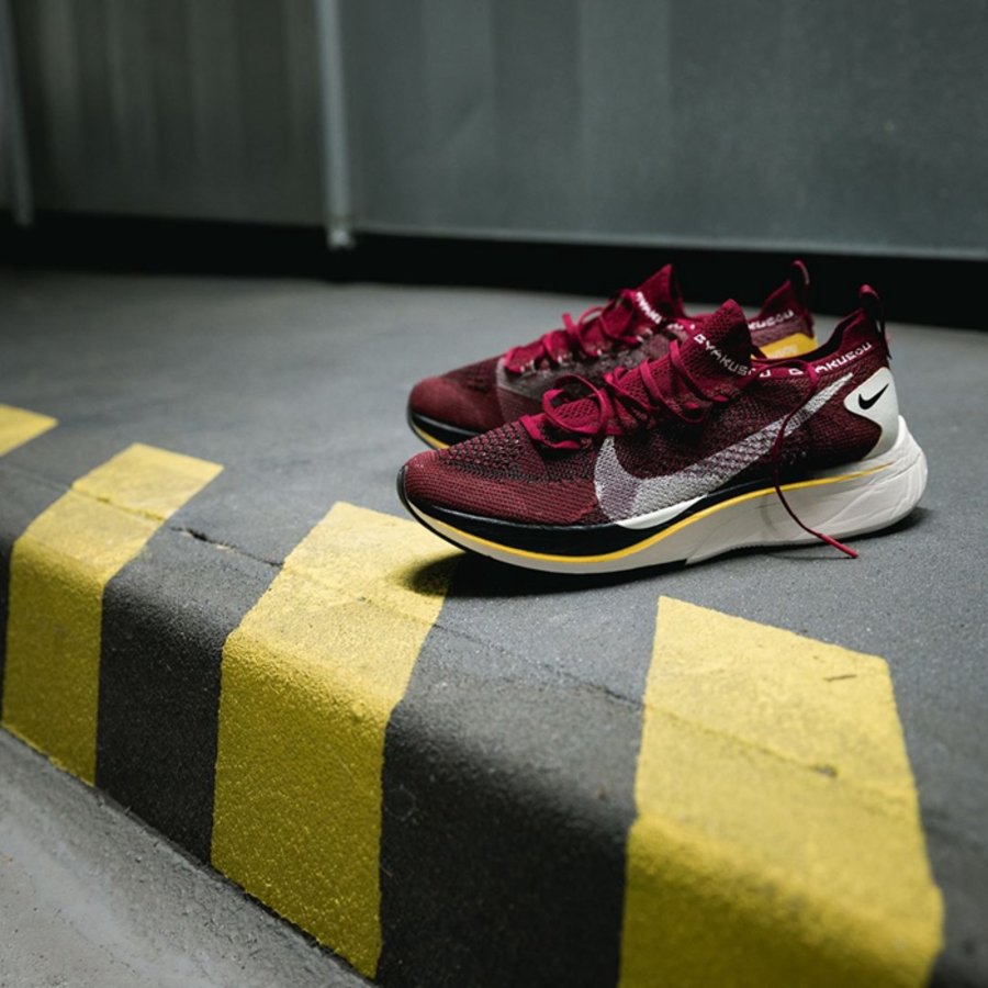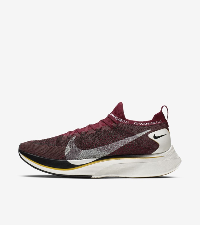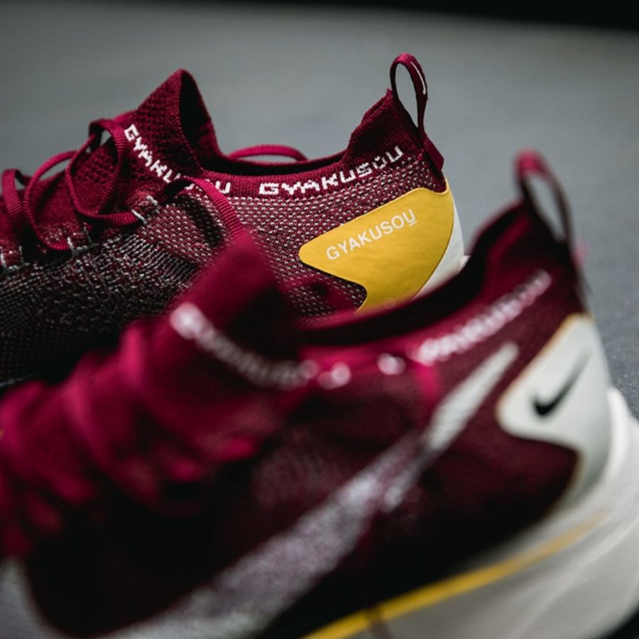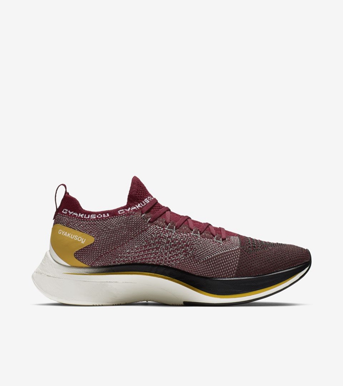 Vaporfly 4% Flyknit 以酒红色装点鞋面,中底线条以黄色点缀,领口处通过刺绣方式的 “GYAKUSOU” 字样,彰显独特联名身份。