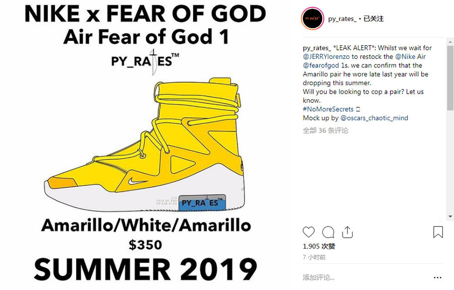 除了这款配色,本周还曝光出另外一双黄色 Air Fear Of God 1,看上去比首发配色更加抢眼!