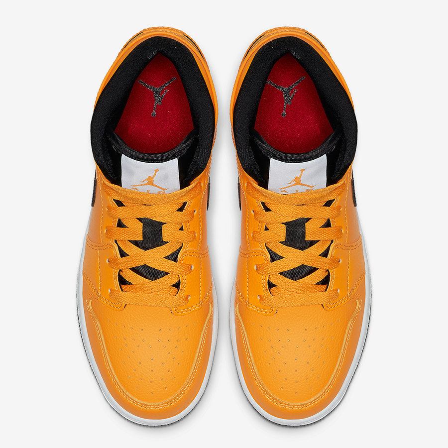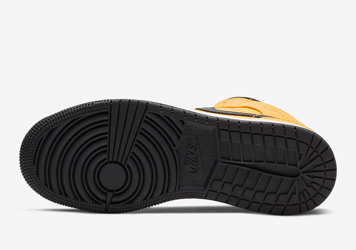 鞋身覆盖大面积黄色荔枝皮装扮,与黑色的 Swoosh、鞋身、鞋底碰撞下,呈现 Taxi 既视感。鞋帮处的 Air Jordan Logo 也从传统的涂色,改为压印,个性非凡。