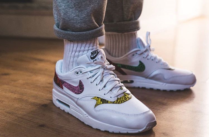 Nike Air Max 1 一直是时尚潮流人士鞋柜中必备鞋款之一。近日,Nike 推出的这双女生专属新品一定会让小哥哥们艳羡不已。 整体以白色为基底,选用辨识度极强的蛇纹元素妆点,鞋面更是注入醒目的黄色、粉色、红色、绿色,让整双鞋抢眼十足。值得一提的是,内外两侧的 Swoosh Logo 还采用了鸳鸯设计,外粉内绿的玩味气质,非常讨喜。 上脚效果也散发出独特魅力,在白色皮革营造的清新气氛中,还透露出几分狂野气息。 目前暂无具体发售信息,我们将密切留意,稍后为大家带来更为详尽的报道。