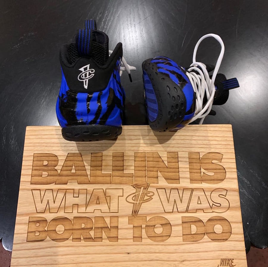 配色灵感来源于当年 NBA 禁止哈达威穿着蓝喷,他便突发奇想,在换衣间拿起马克笔,在 Foamposite One 发泡鞋面的凹槽填补上黑色条纹,不仅满足了 NBA 的规定,还完成了一款全新配色的设计。