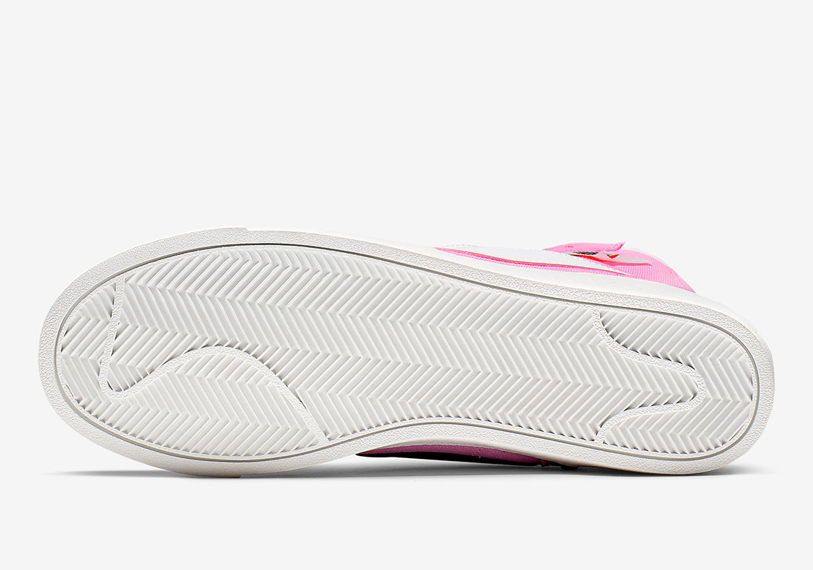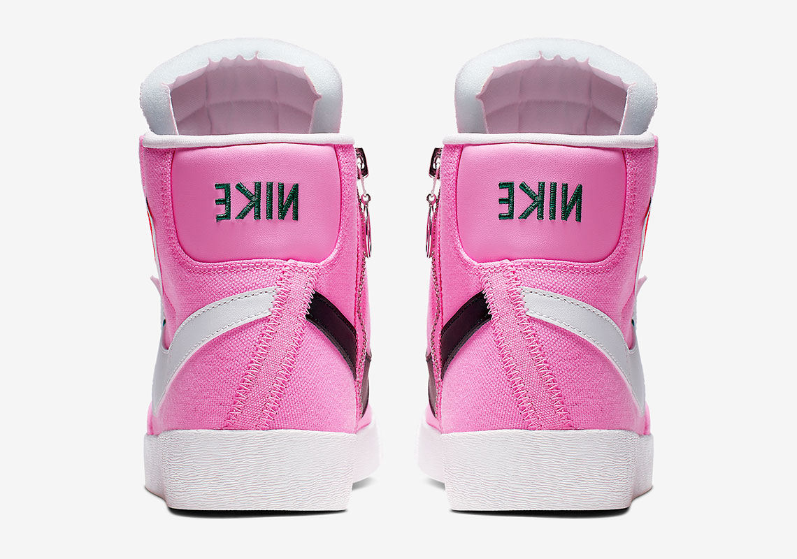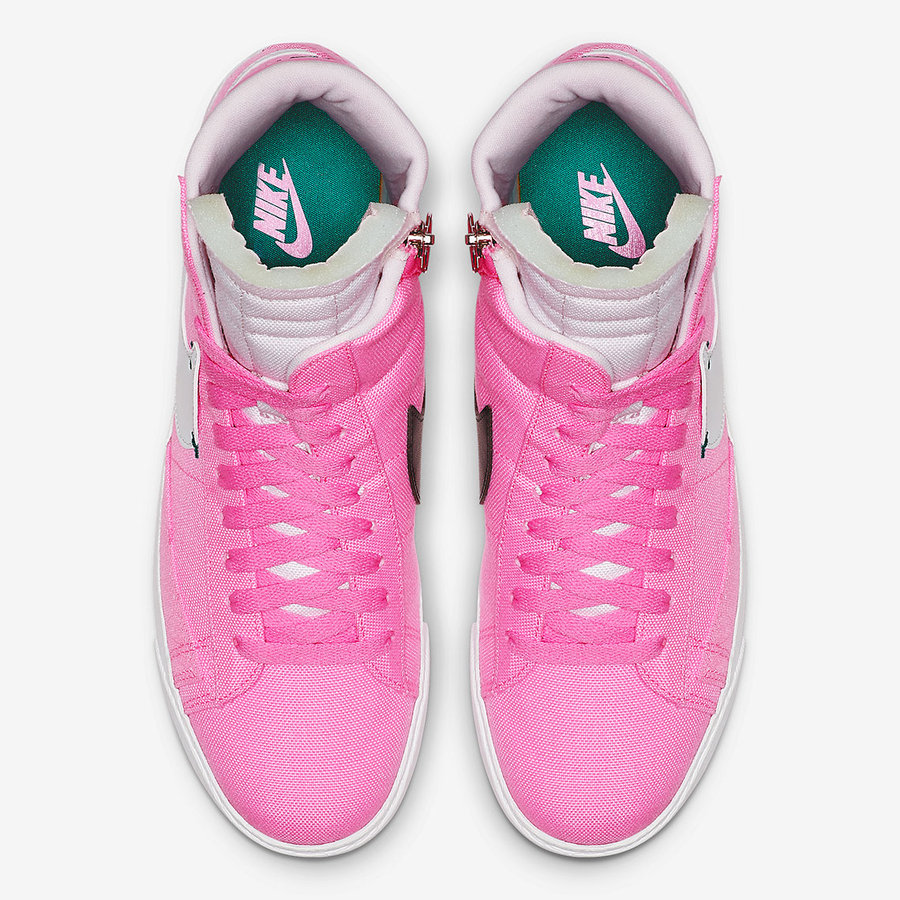 这款配色采用粉色帆布鞋面,鞋内外两侧 Swoosh Logo 采用解构设计,分别为黑、白两色。