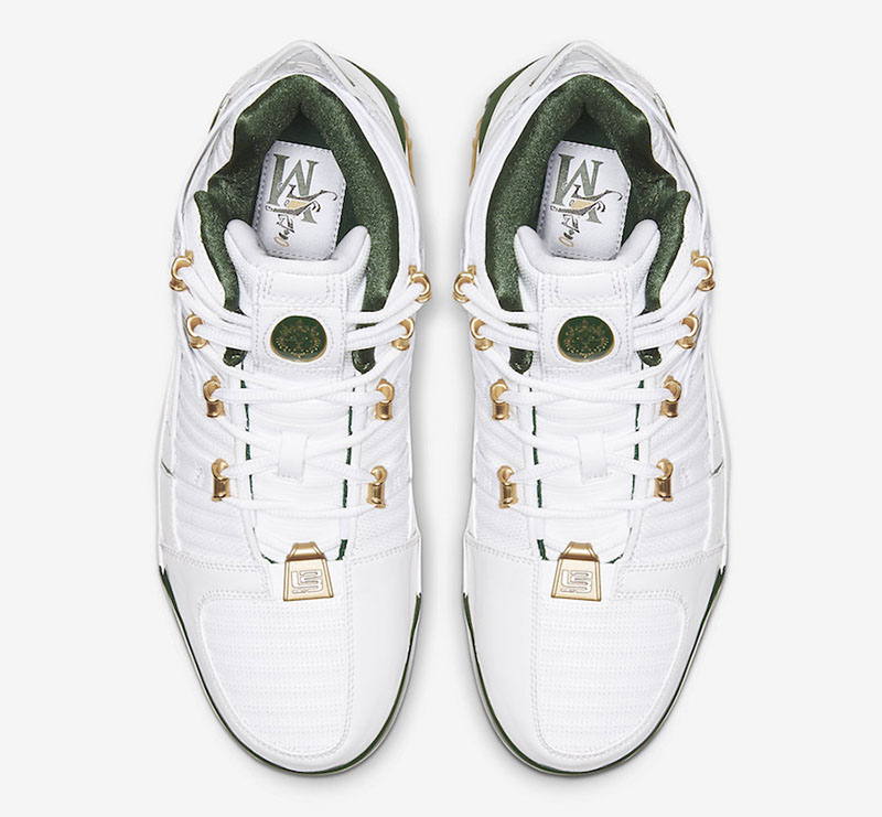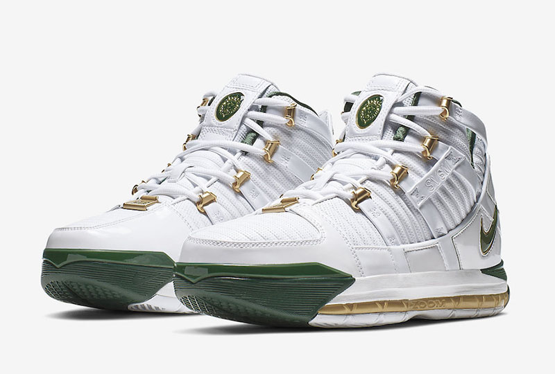 眼前这双 Nike LeBron 3 “SVSM” 主场配色以白色为基础,辅以高中队标中抢眼的金色与墨绿点缀细节。