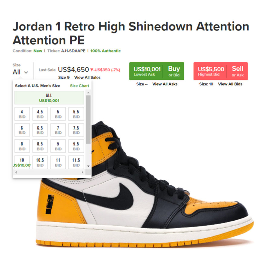不过在去年年中时,Jordan Brand 曾为美国摇滚乐队 Shinedown 打造了一双专属黑黄配色,让不少球鞋玩家大呼过瘾,炒卖价高达 $10000 美元的天价,更是已经断码,绝对算得上一鞋难求!