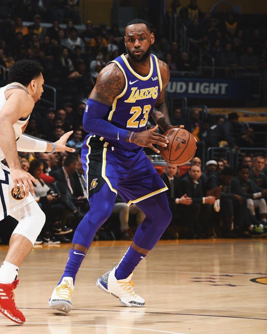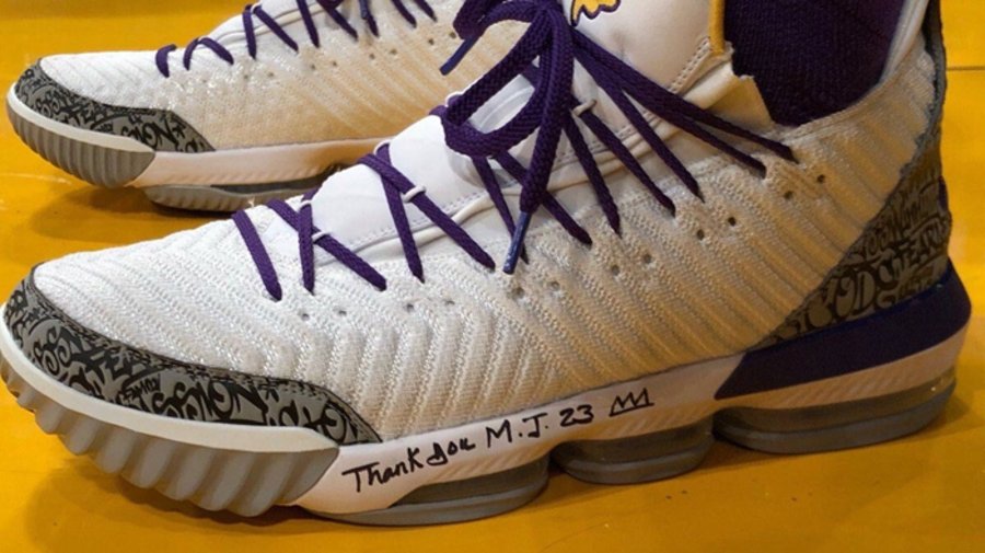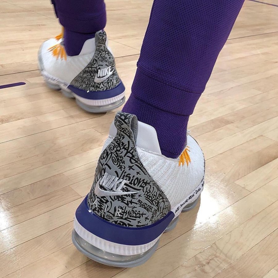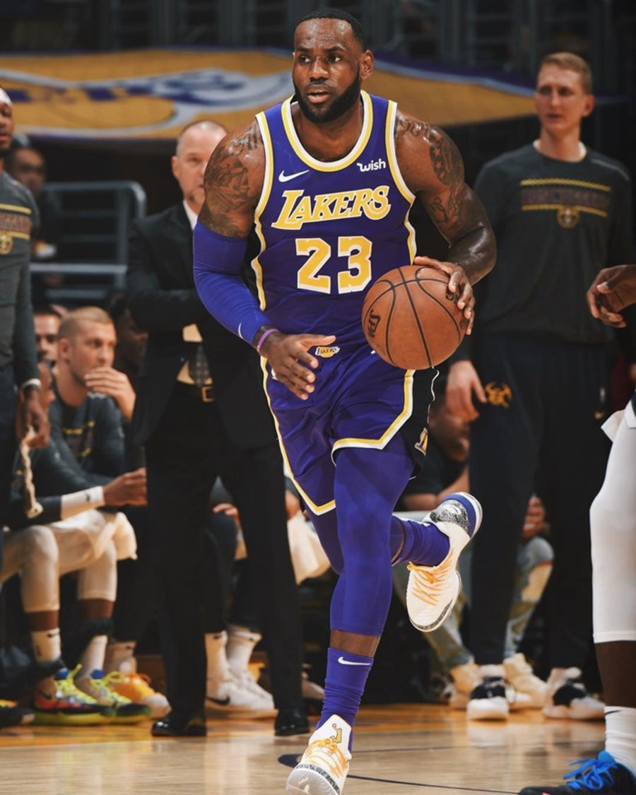 在昨日湖人对阵掘金的比赛中,詹姆斯以 31 分 7 篮板 7 助攻的准三双数据,完成对篮球传奇乔丹常规赛总得分的超越。而他上脚的一双 Nike LeBron 16 PE 配色也是格外吸睛。