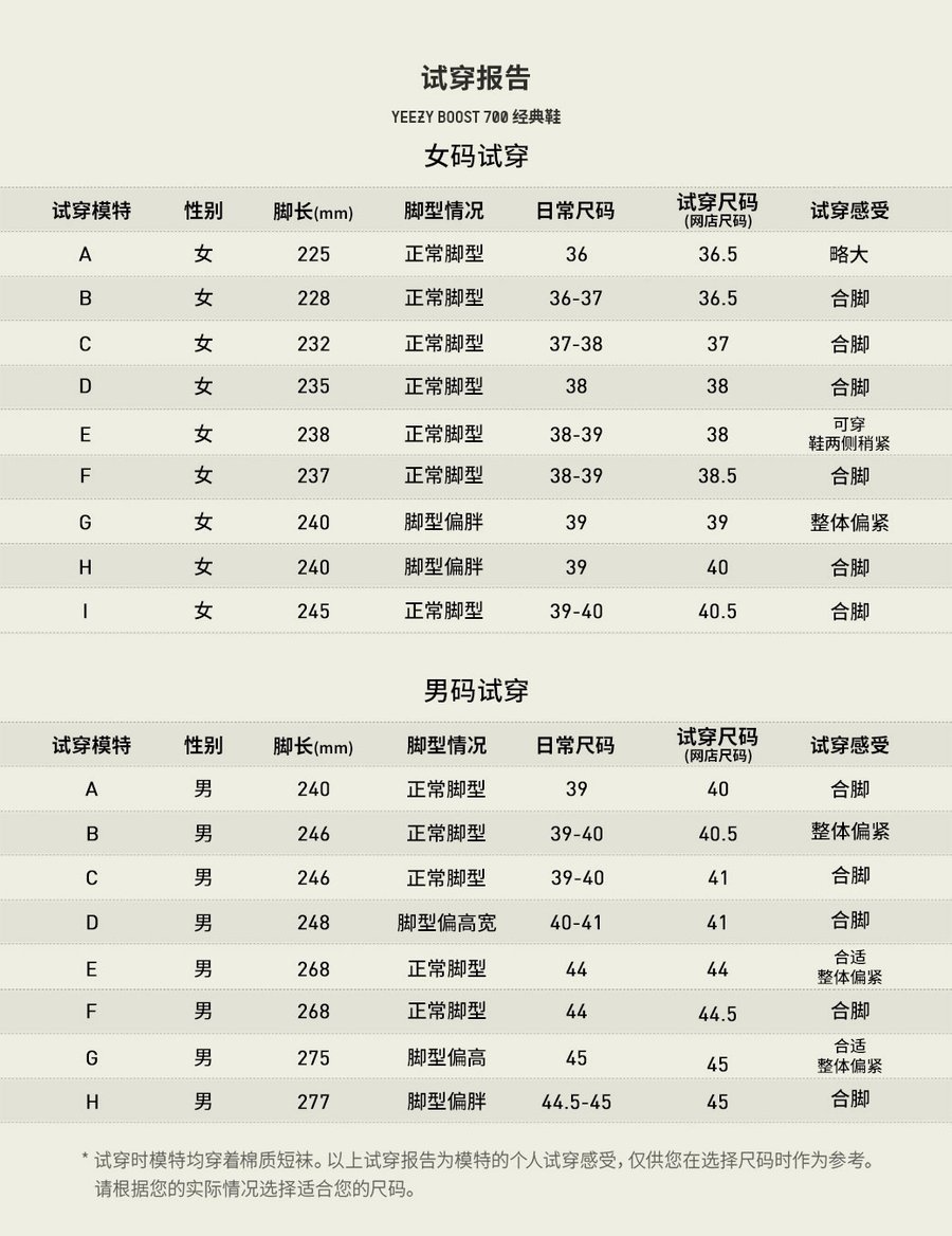官方这次也贴心地为大家准备了试穿报告,大家可以量量自己的脚长并结合自己的脚型,参考表中模特的尺码进行选购。