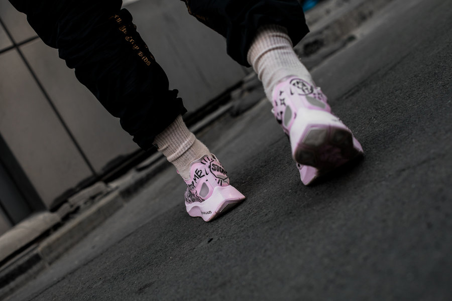 清爽宜人的浅粉色主色调呈现黑色涂鸦,蝉翼鞋面和白色中底有覆盖,活泼跳动的画风,也给人一种轻松愉快的感受。