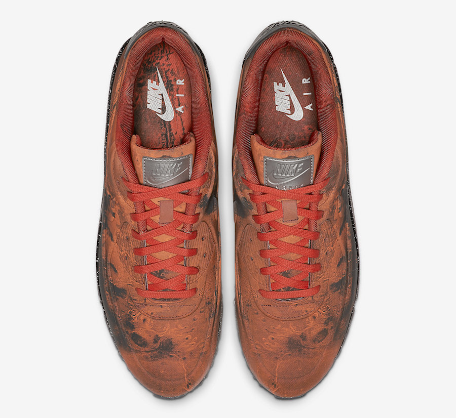 这双 Nike Air Max 90 “Mars Landing” 采用了类似的设计思路,全鞋面呈现火星表面的红色纹理图案,黑色中底妆点泼墨细节,整体精致细腻又富有视觉冲击力。