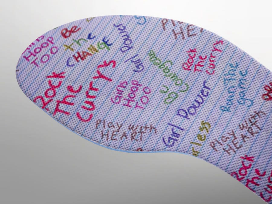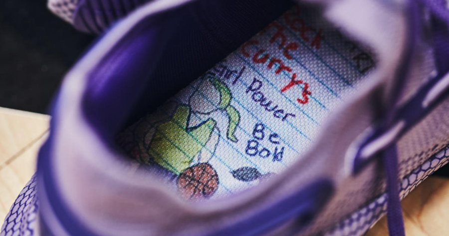 鞋身以紫色为主色调,不同深浅的变化带来更丰富的视觉感受。鞋垫上以手写字体呈现小女孩的 “勇往直前”、“女子力”、“挑战现状”、“女孩也能上球场”和“拥有自己的Curry”等主题文字,彰显妇女节主题。