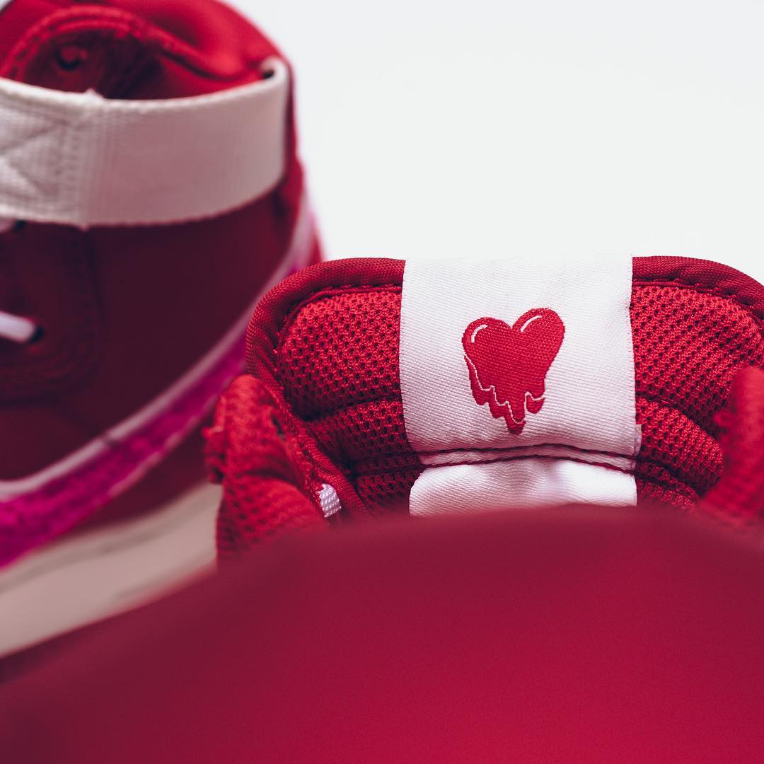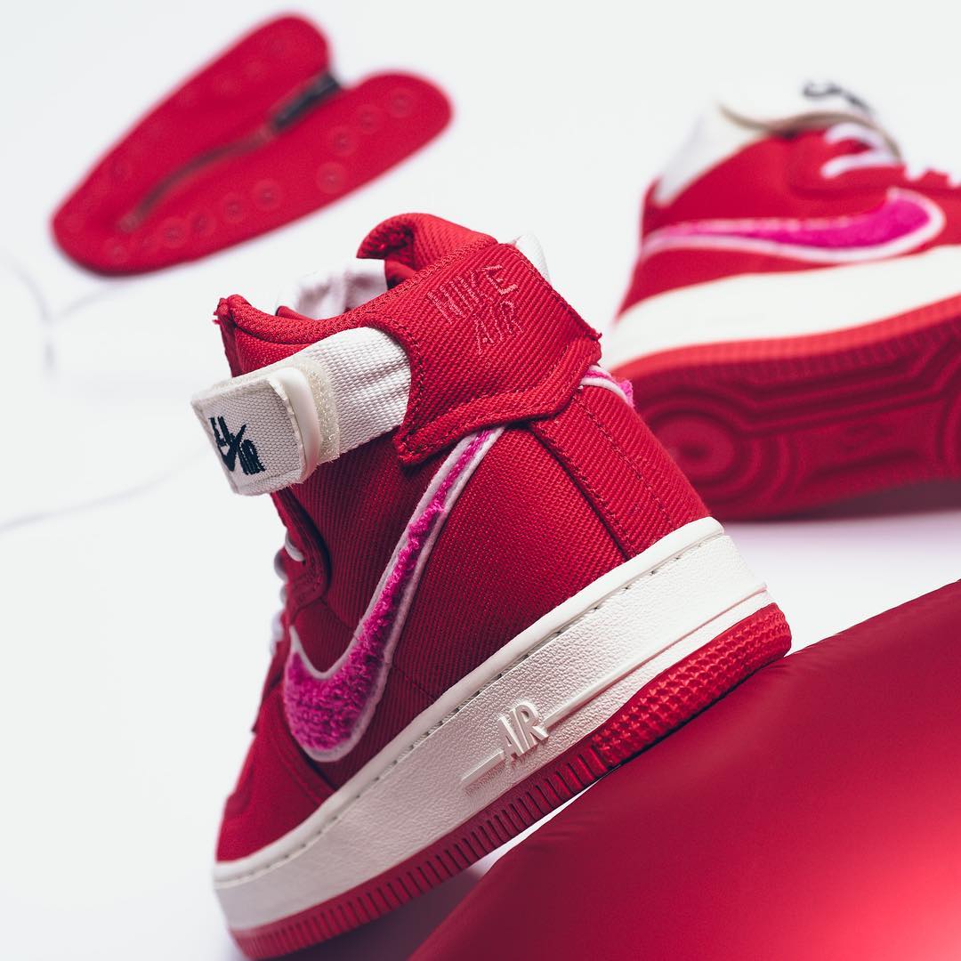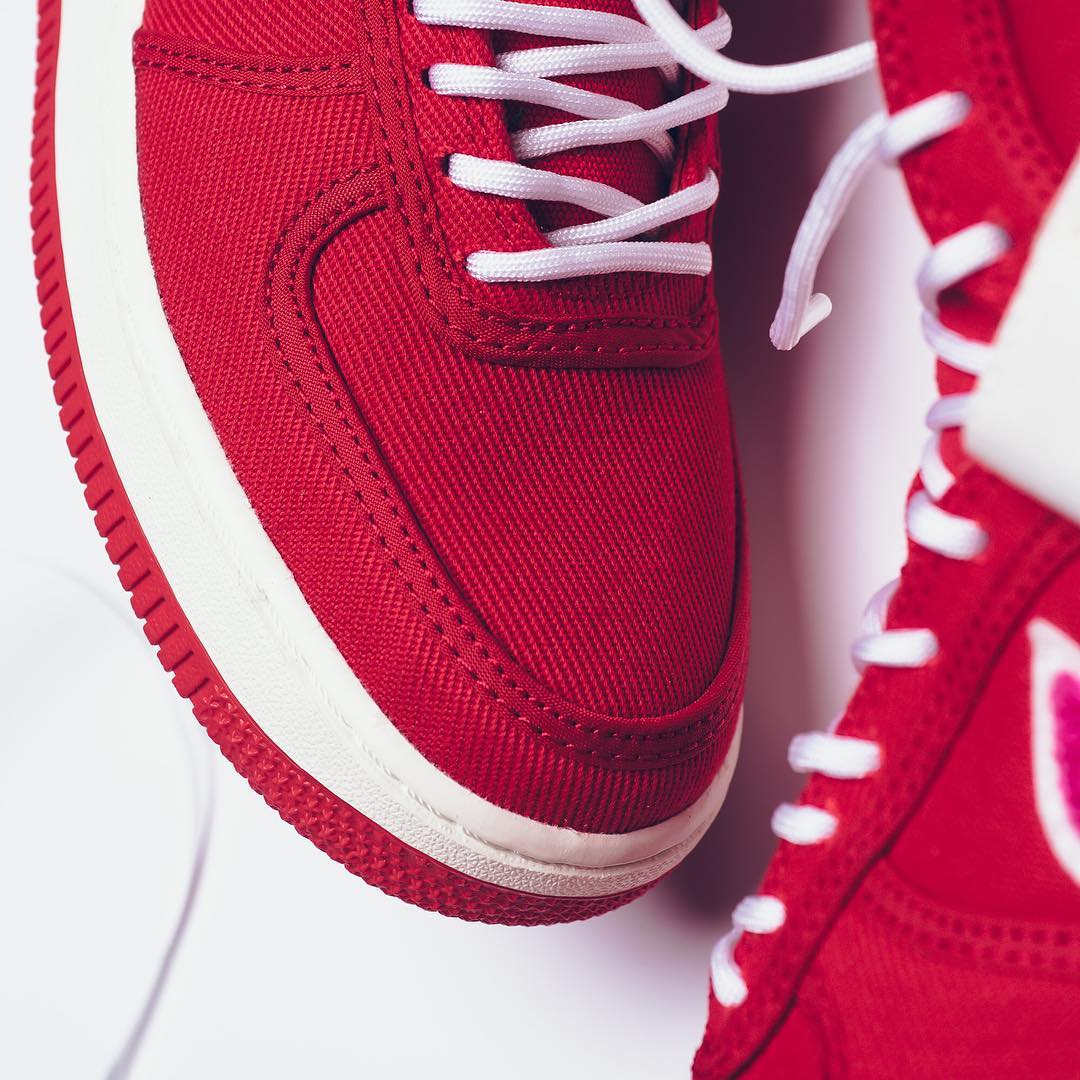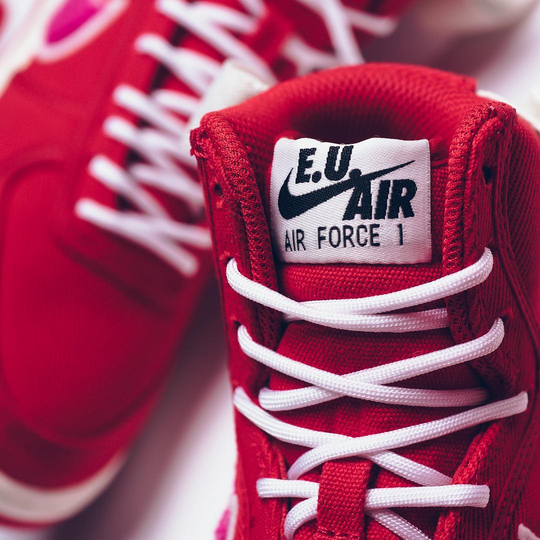 白色魔术贴上带有 E.U. x Air Force 1 字样,鞋舌外侧相同 Logo 点缀,内侧暗藏桃心标志。