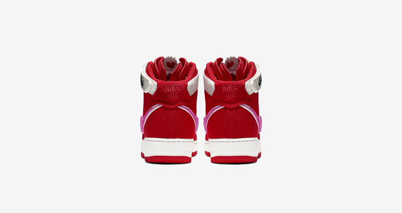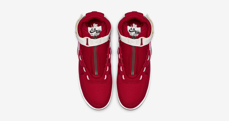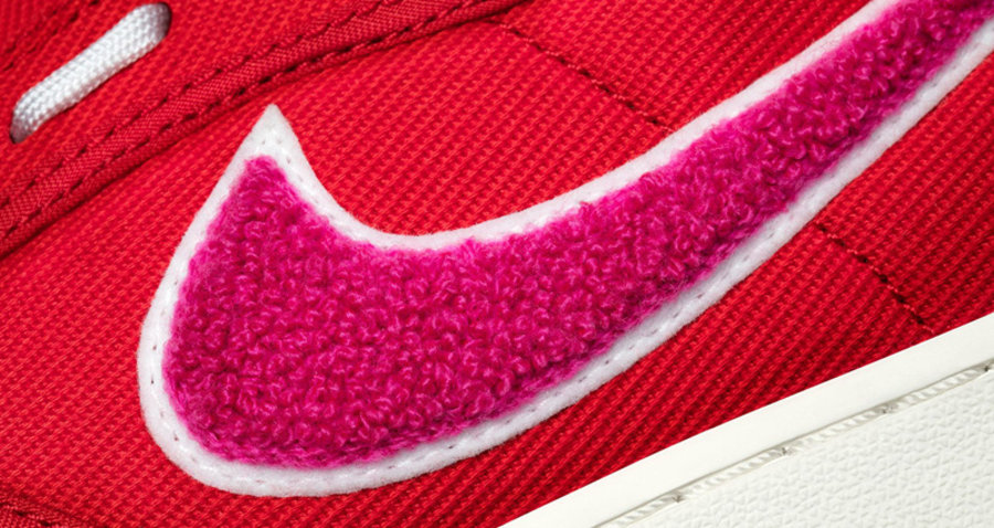 鞋面由大红色帆布材质打造,粉色摇粒绒 Swoosh Logo,米白色魔术贴上带有 E.U. x Nike 标志,可以说辨识度极高。