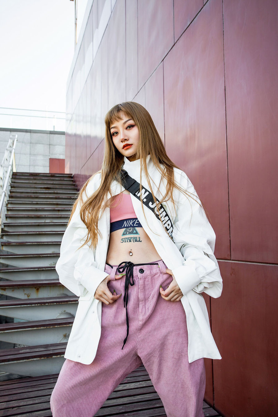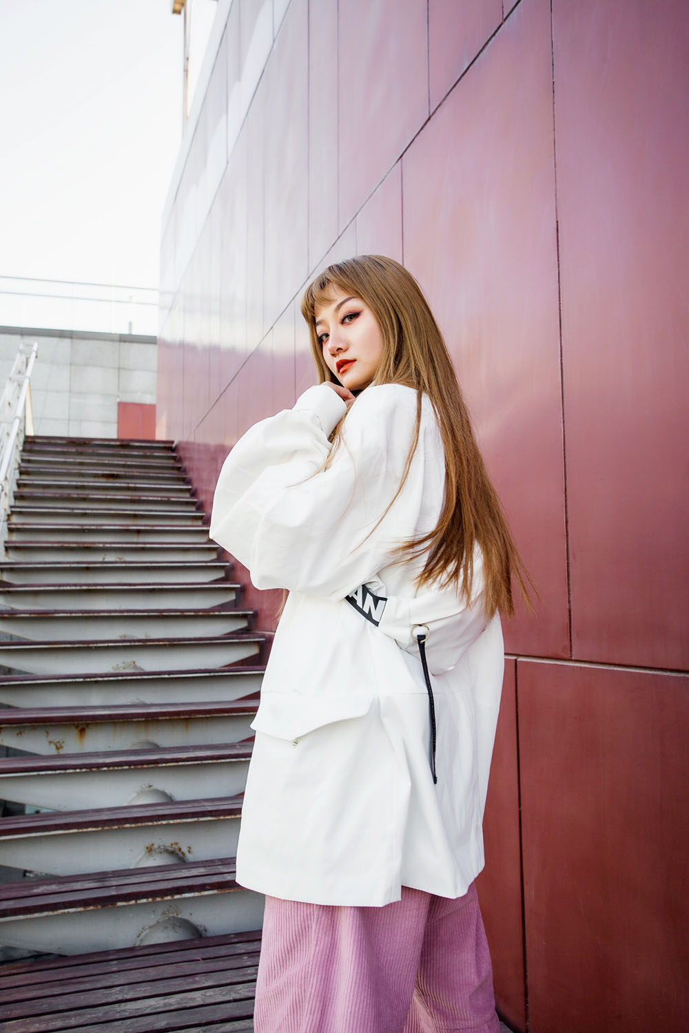 第二身穿搭选择了浅色系风格,搭配完的效果出人意料的好看。