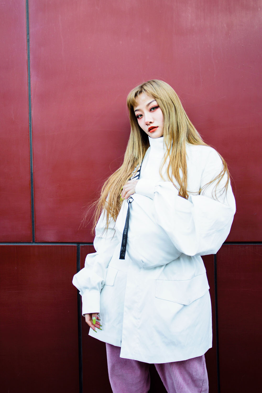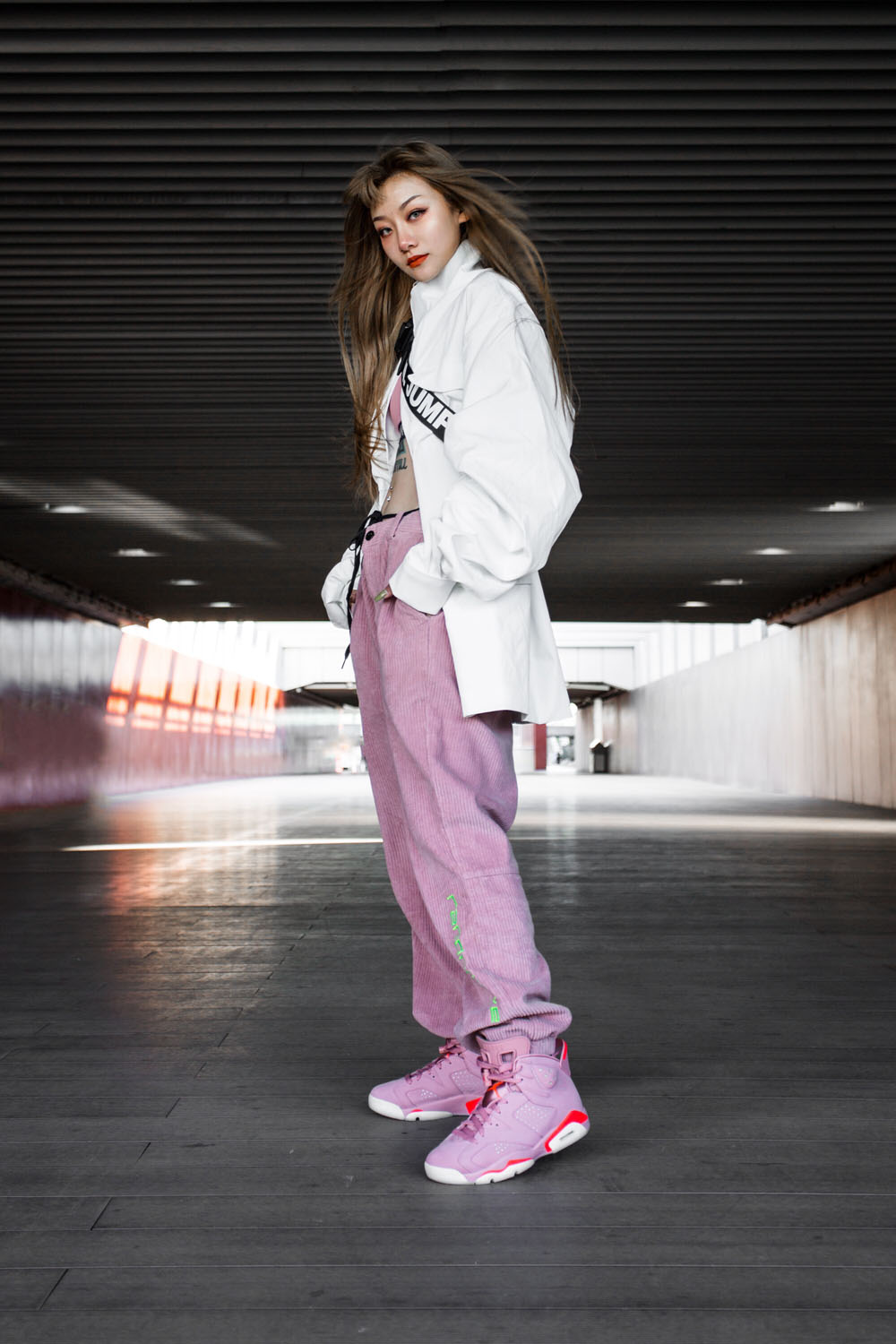 上身白色 ROARINGWILD 外套再加上 Jordan 腰包,注入了十足的机能元素。