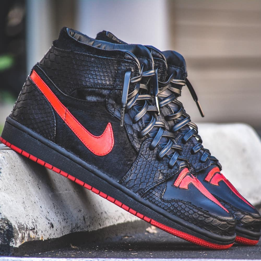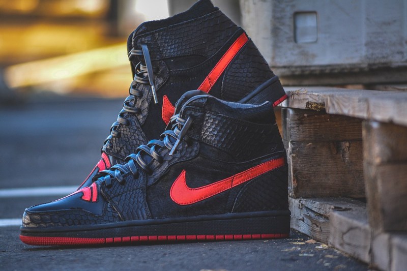 这双 Air Jordan 1 在鞋头呈现了硕大的 Tesla Logo,采用了鳄鱼皮纹材质打造,黑红的色调也是既低调又格调不凡。