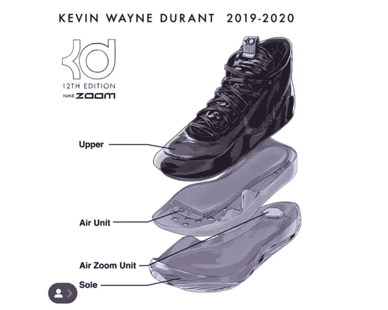 KD12 采用了双层 Zoom Air 气垫的方案,一块全掌的 Zoom Air 气垫搭配一块六边形的后跟 Zoom Air 气垫。