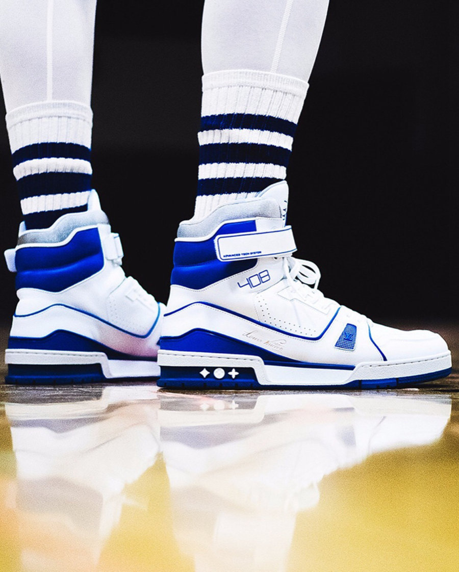 鞋面以白色为底色,搭配蓝色线条、色块装饰。408、Louis Vuitton 花体签名以及 LV Logo 分部在鞋面多个位置,中底后跟标志性 LV 老花纹样。