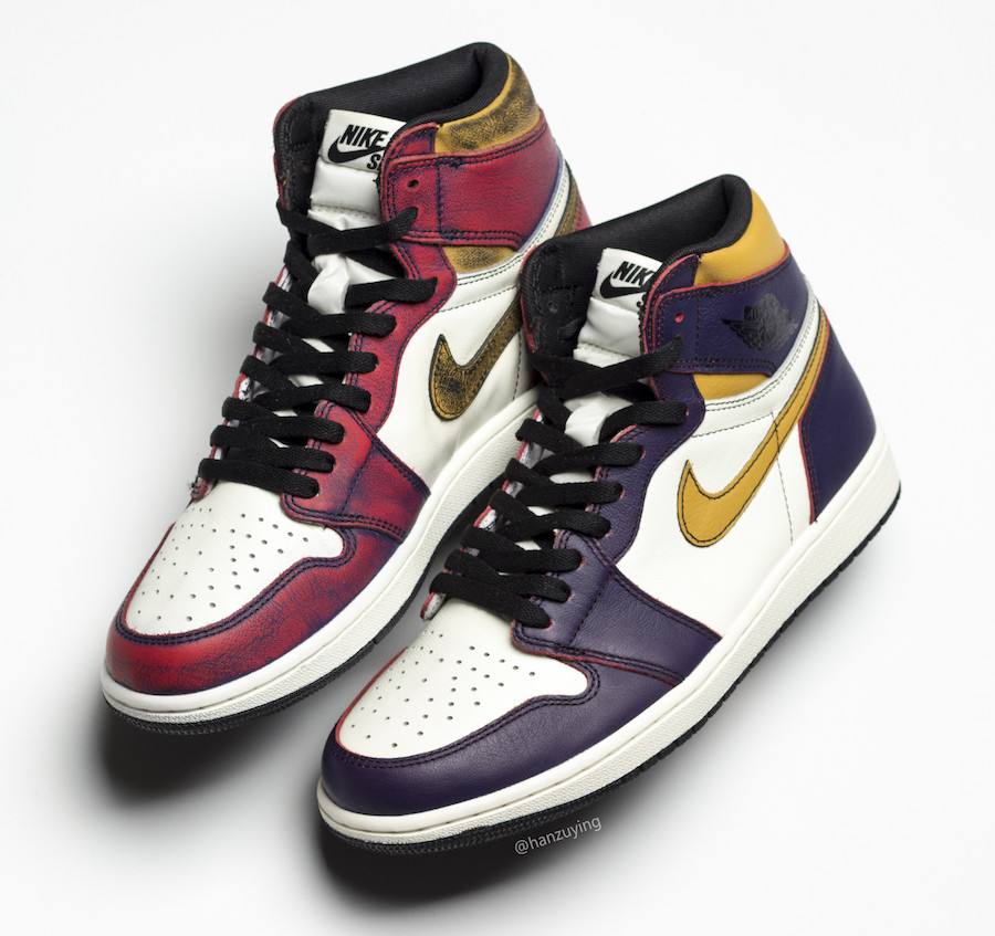 鞋身在白色的基础上,加入大面积的紫色和黄色,让人一眼看去就能想到是一双湖人配色的 Air Jordan 1。