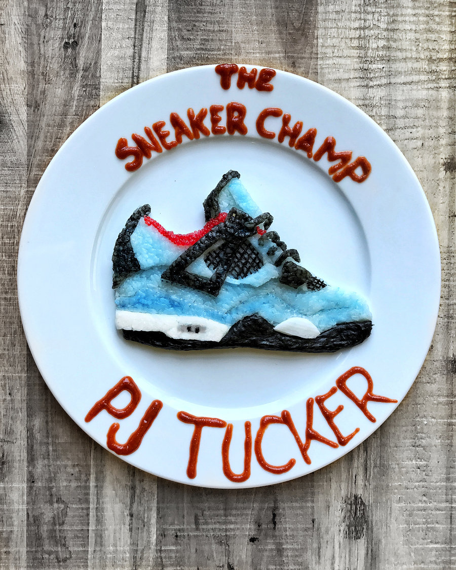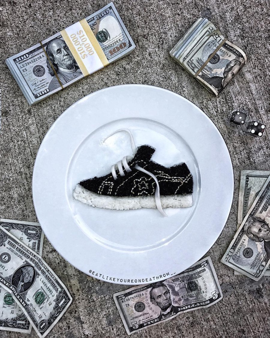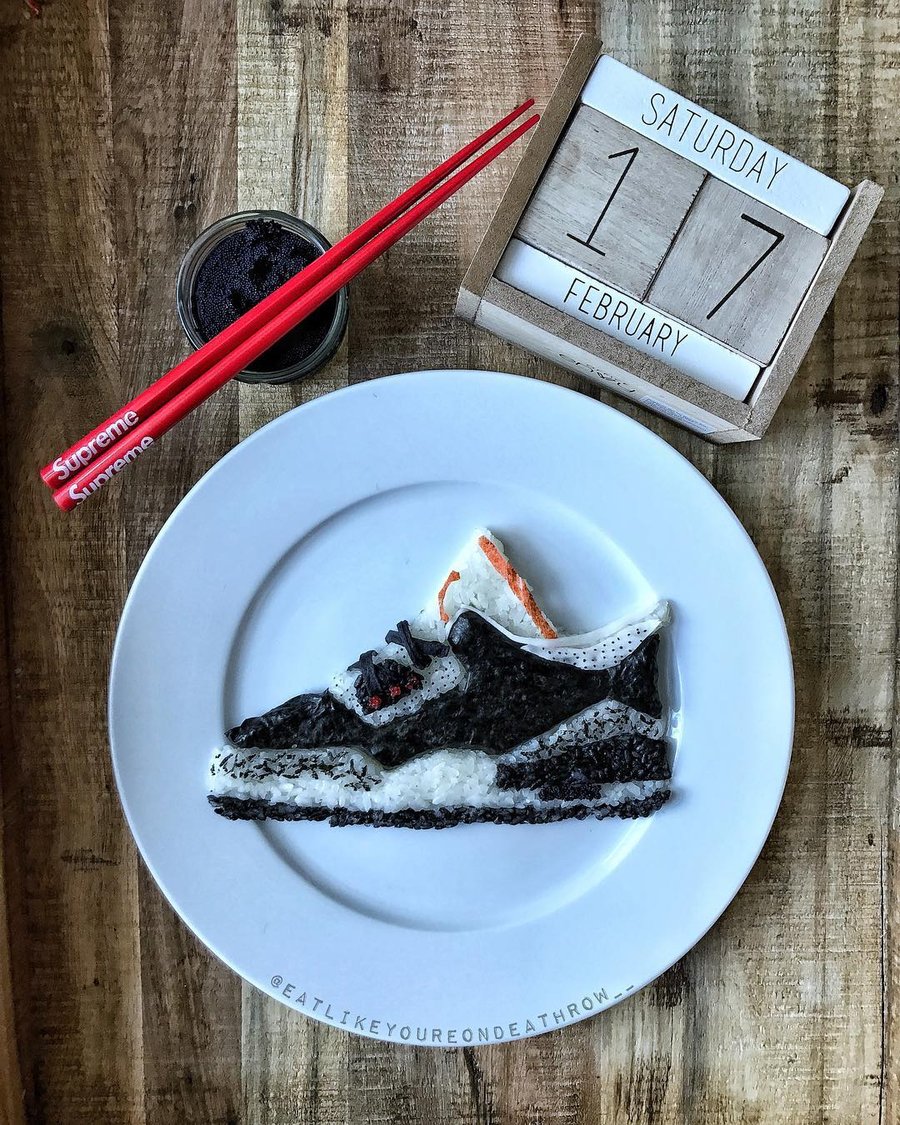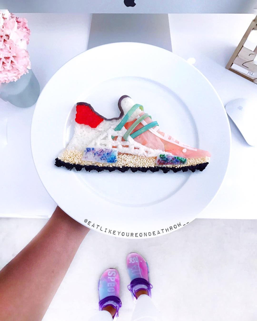 相比上刚才那位,这个 Instagram 账号叫 @eatlikeyoureondeathrow__ 的妹子,是真的用食材进行球鞋主题的创作。