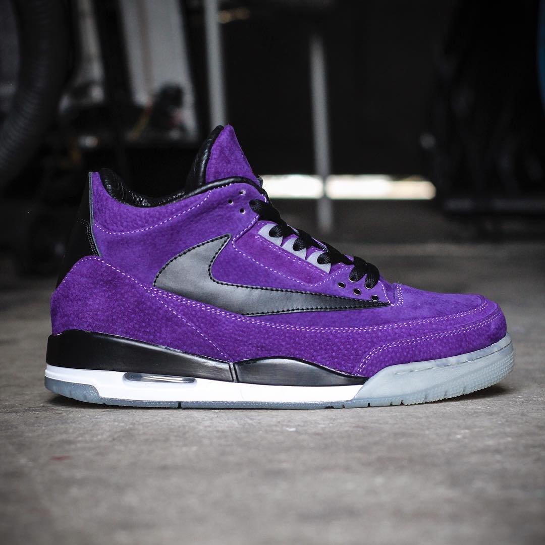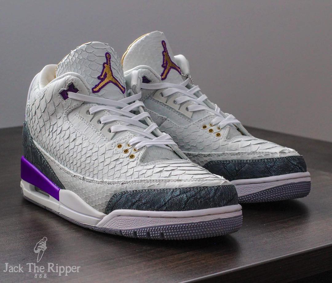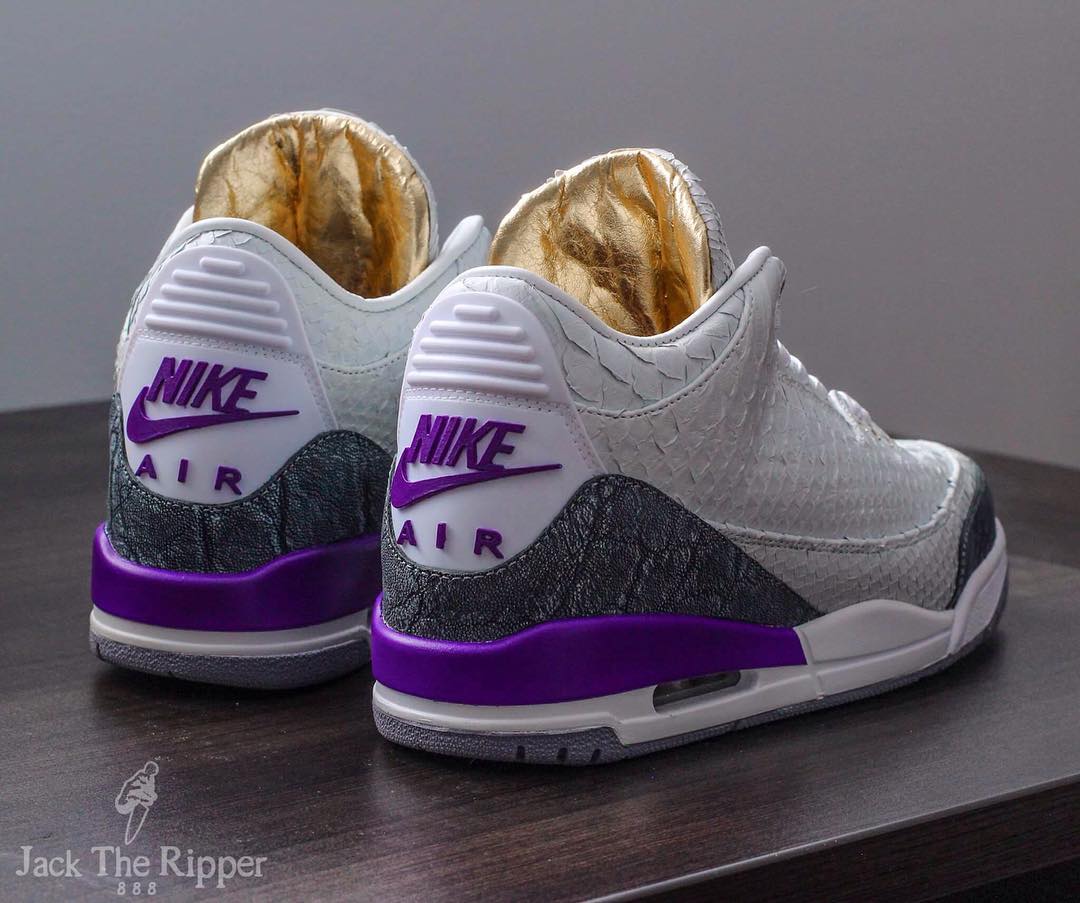 同样让人惊艳的 Air Jordan 3 还有这双紫金湖人配色,蛇皮纹理的鞋面霸气而奢华,特别是金色的皮革内衬显得贵气内敛。