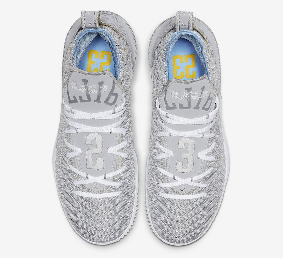 与 Zoom Kobe 1 相同,这款 LeBron 16 同样以灰色为主调,在鞋底、内靴、Logo 等处点缀北卡蓝和黄色。
