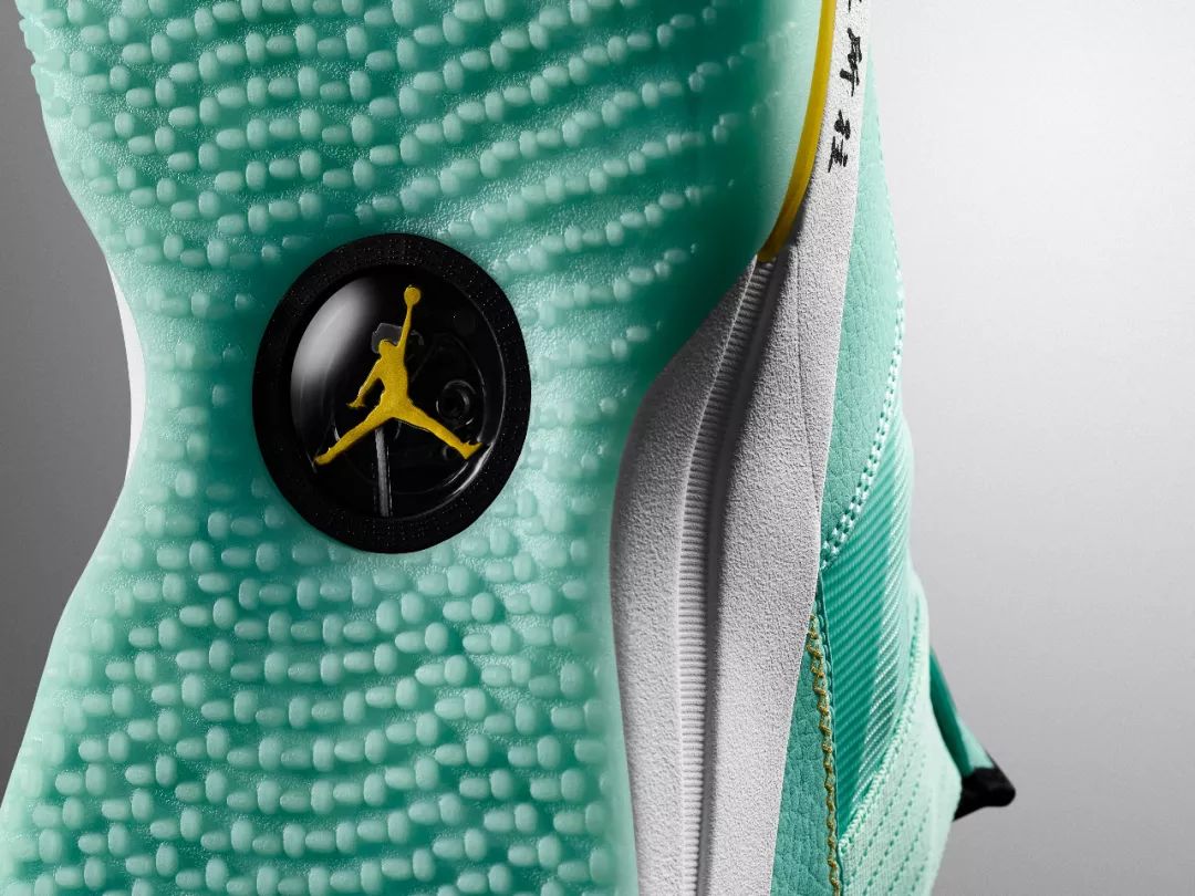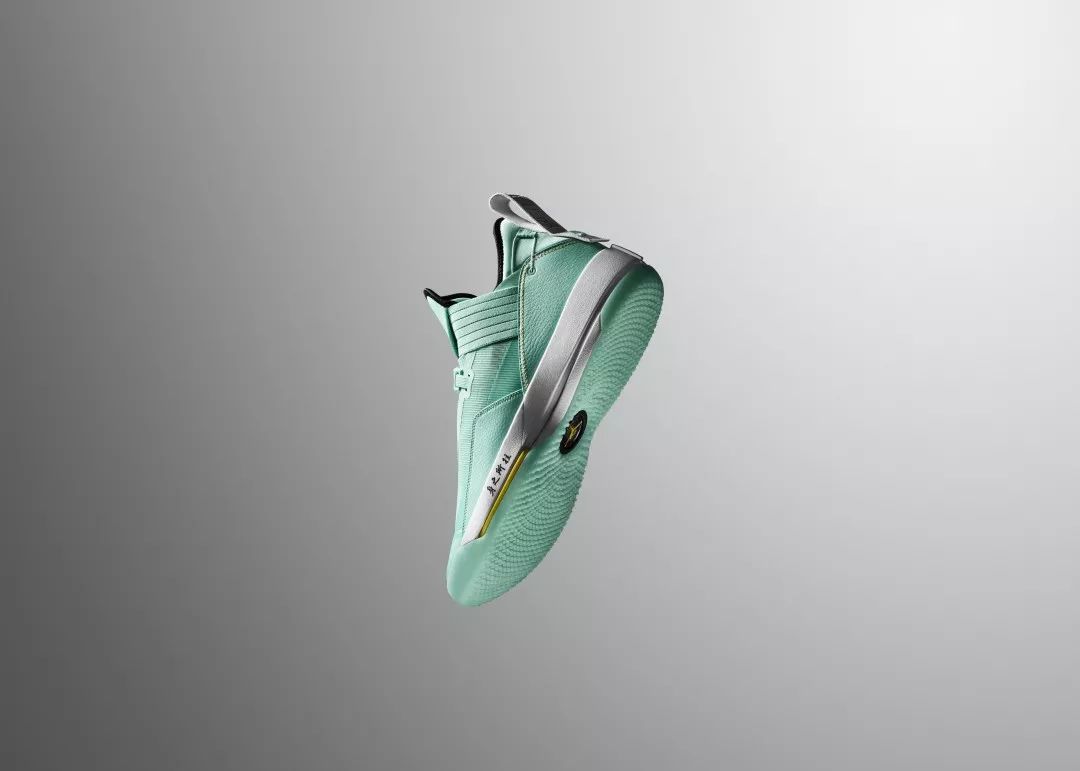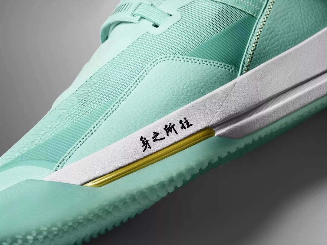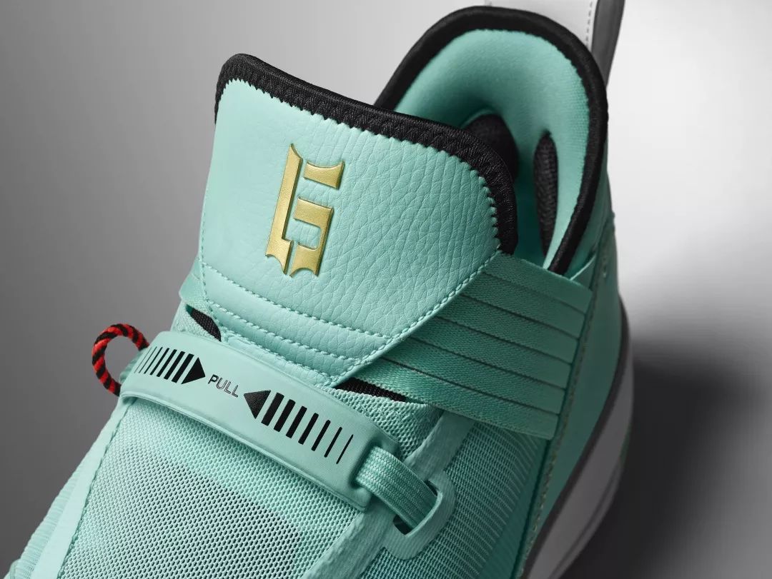 此次整双鞋都已郭艾伦喜欢的湖绿色为主调,也被国内玩家成为中国玉配色,鞋舌上金色的大写字母 G 代表着 “郭” 的首字母缩写。