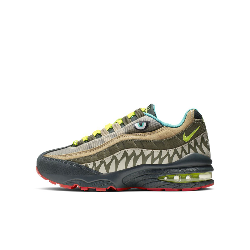 鞋面使用多种不同材质和颜色的物料拼接而成,包括卡其色和橄榄绿色麂皮、鞋头处独特格纹皮料以及 Air Max 95 标志性的网眼等多种材质。