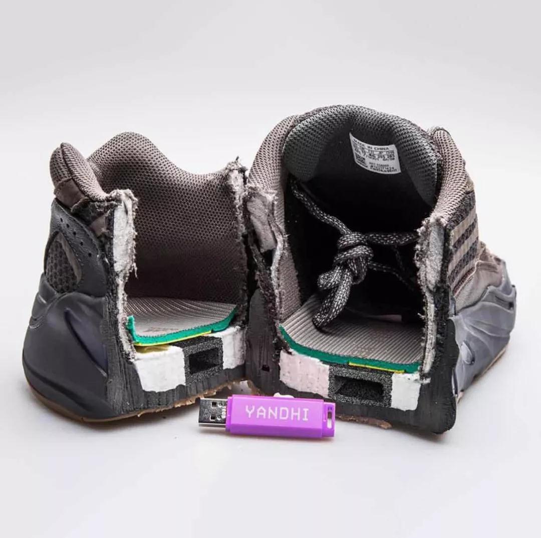 正如这双 Yeezy 700 的官方命名 “晶洞” 一般,将鞋子切开后,侃爷竟然在鞋内暗藏了一支 U 盘。