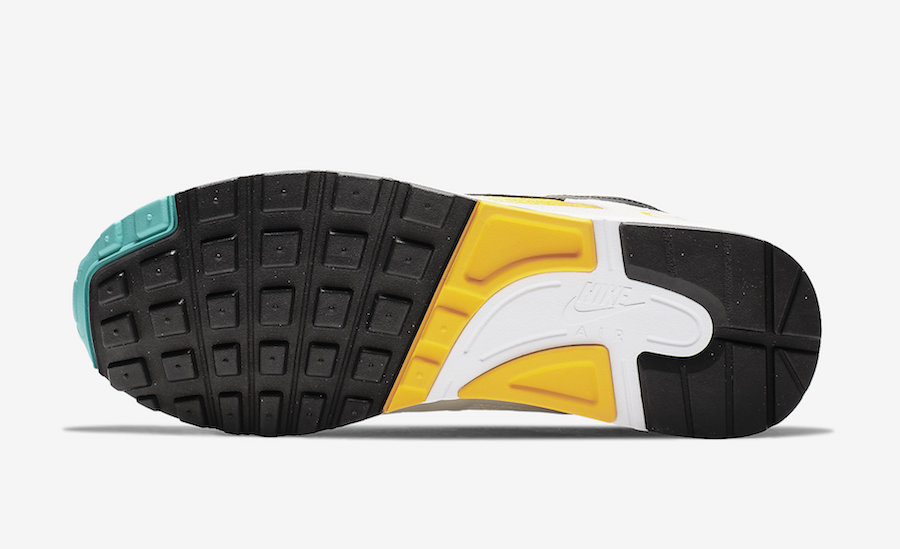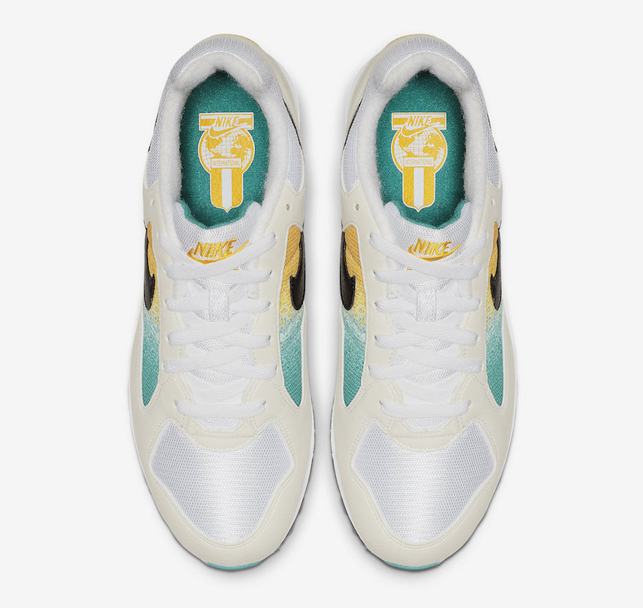 这双跑鞋大面积采用翻毛皮与尼龙材质,回归早期复古跑鞋设计。鞋身中部由亮黄色至湖水绿,鞋尾草体手写 Air Skylon 2 Logo 和皮质天黑色 Swoosh Logo 相呼应。