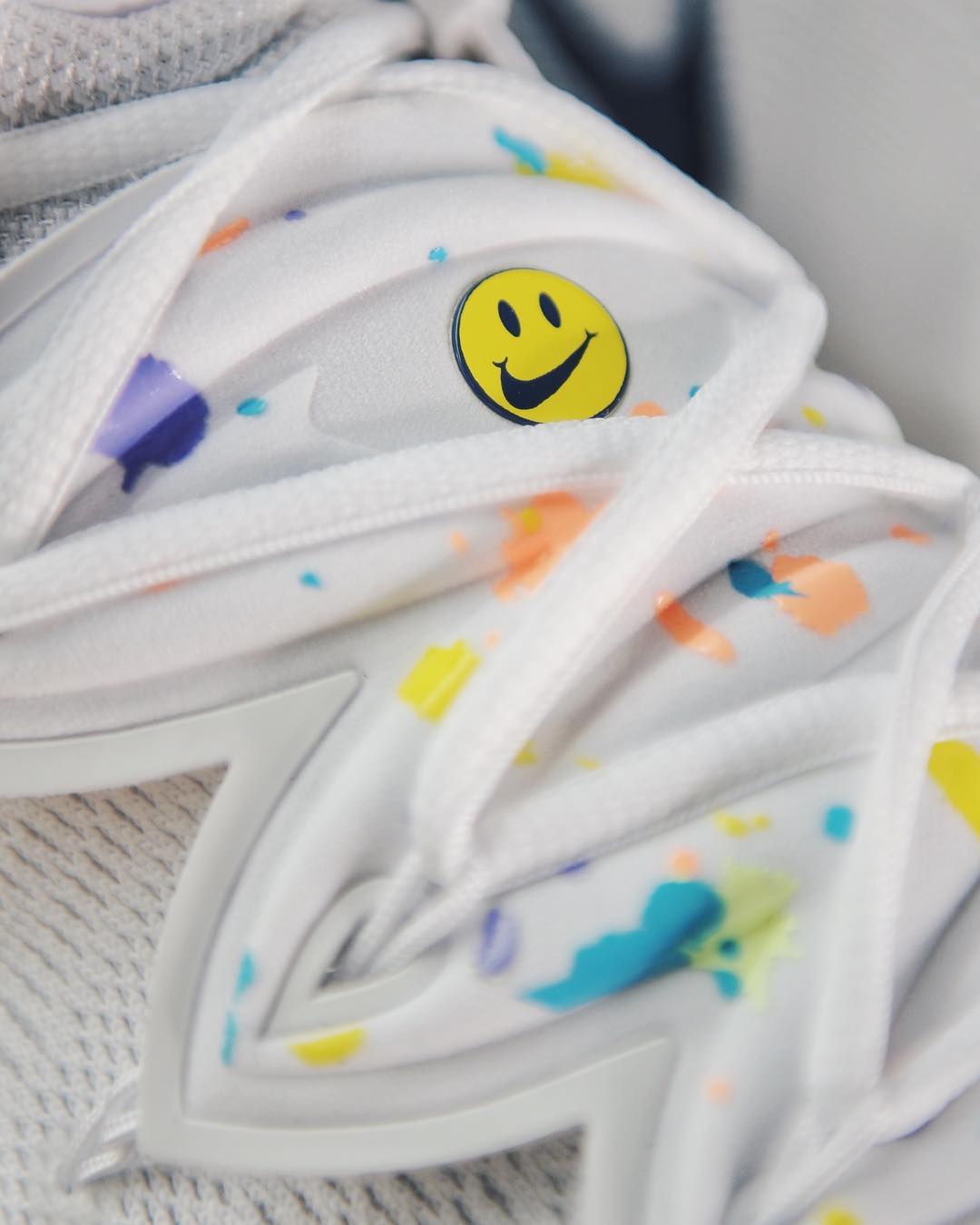 鞋身中部的白色捕虫草,融入了彩色泼墨细节,标志性的笑脸 Logo 格外吸睛。