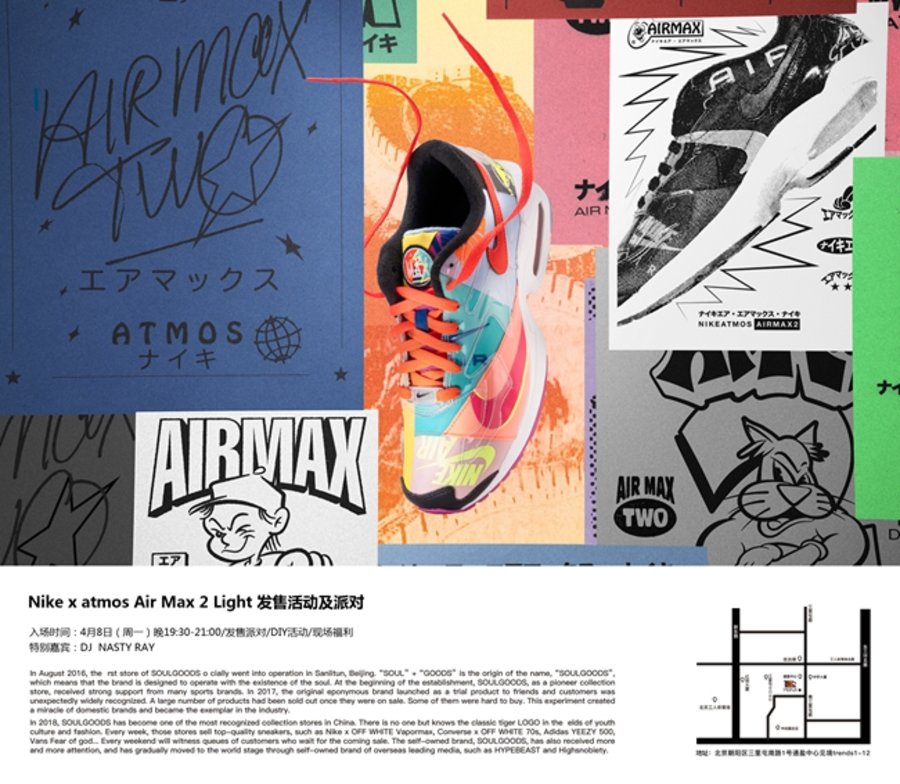 在活动期间,除本次步入发售的 Nike x atmos Air Max 2 Light,SOULGOODS 还将联合 HIP HOP 音乐人 NASTY RAY 及其团队带来 90 年代 HIP HOP 派对。