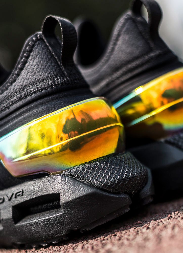 这双鞋最大的特点,莫过于这个具有镜面琉璃色彩的后跟支撑了。