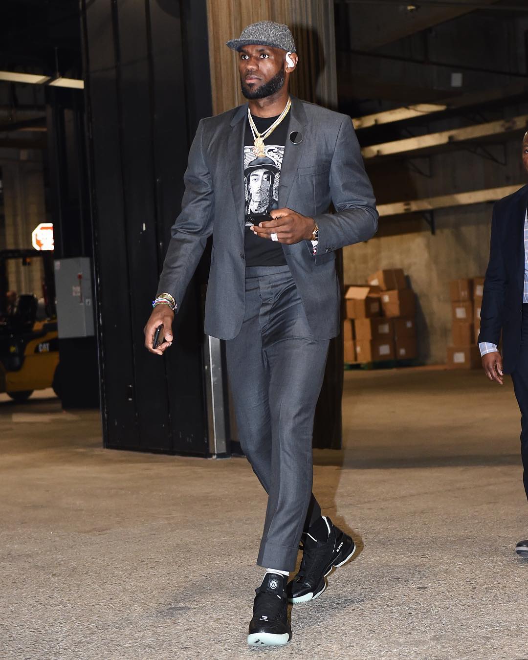 闲来无事的詹姆斯,衣着得体,长坐在场边观战;