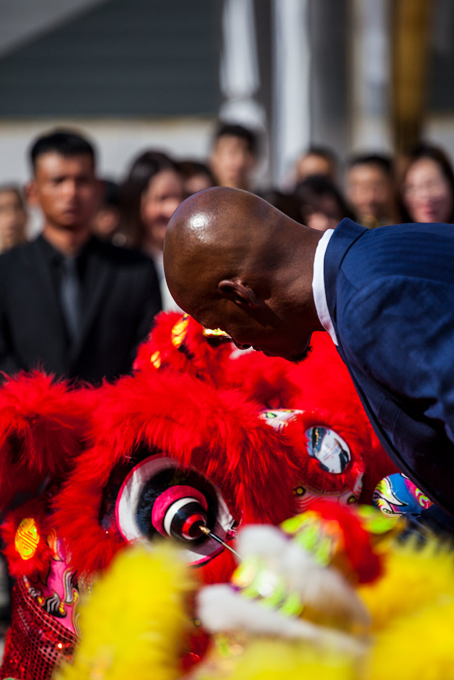 开业庆典由带有浓于中国氛围的舞狮表演拉开序幕,雷阿伦更是参与了点睛过程,唤醒寓意祥瑞的狮子。