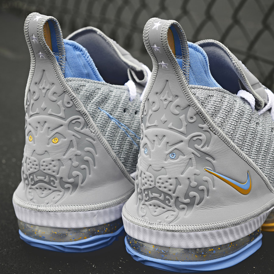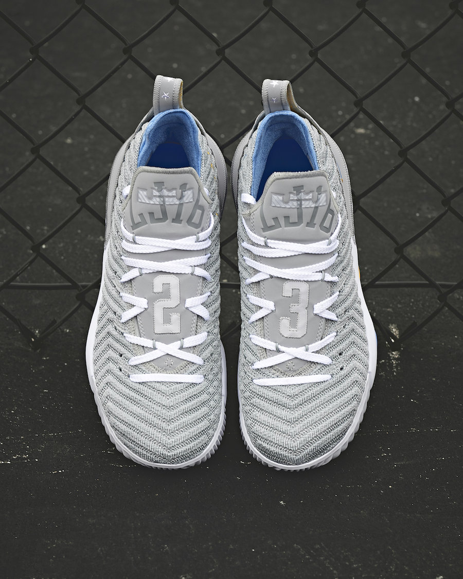 与 Zoom Kobe 1 相同,这款 LeBron 16 同样以灰色为主调,在鞋底、内靴、Logo 等处点缀天蓝和黄色。