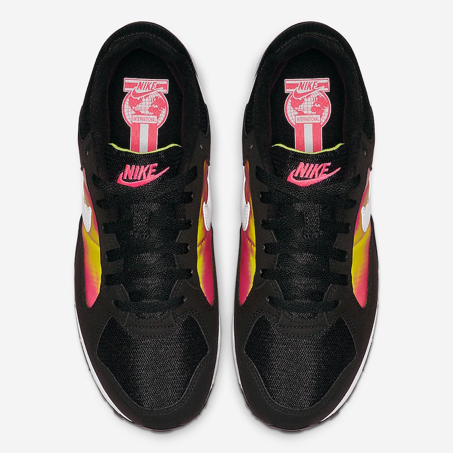 鞋面以黑色皮革与灰色编织材质拼接,鞋身中部以亮黄色与粉紫混合渐变,后跟 Air Skylon 2 签名以亮粉色呼应,带有很强的夏日欢快气息。