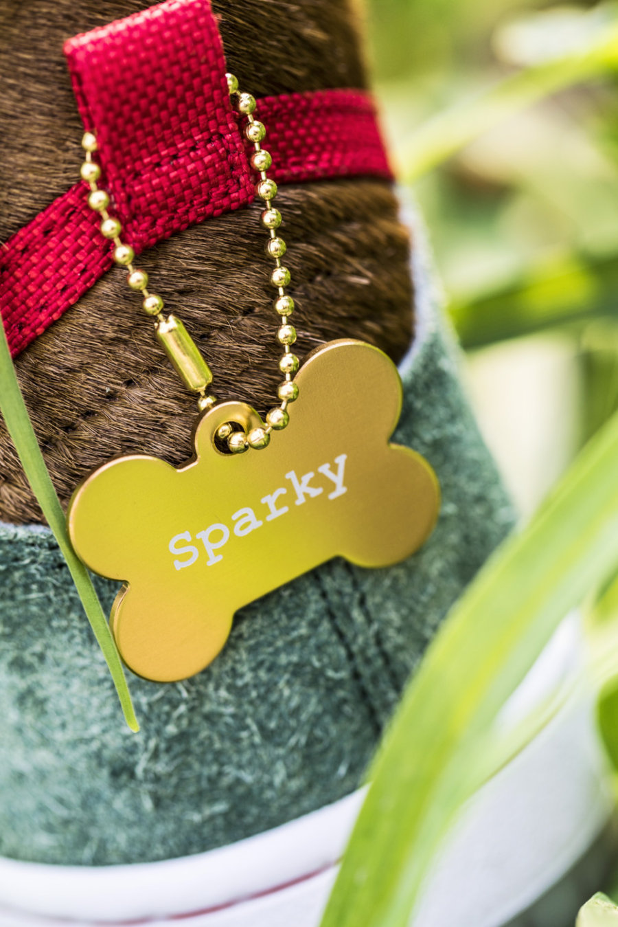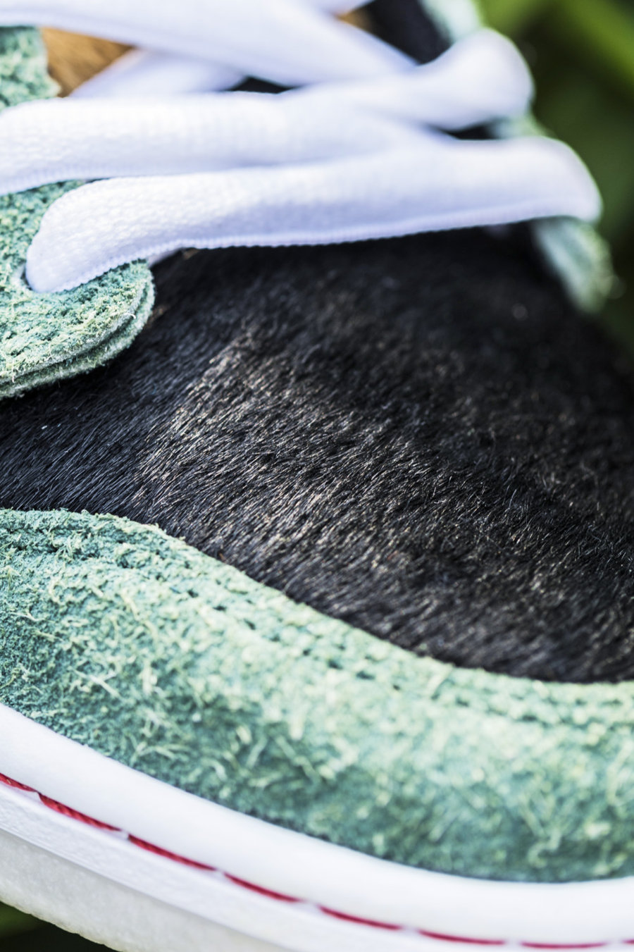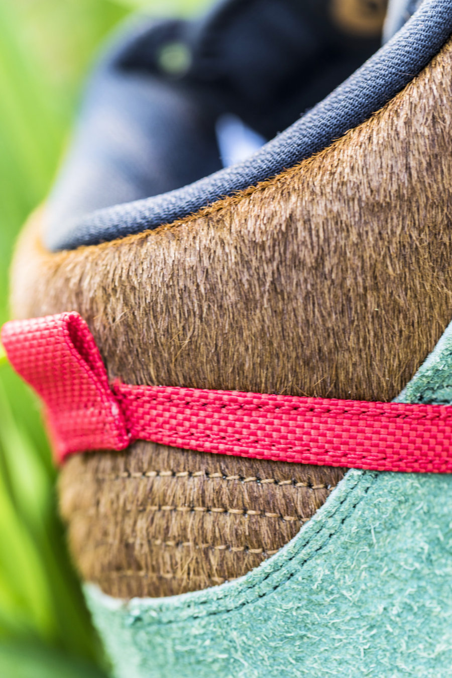 鞋面使用了质感独特的绿色长绒翻毛皮材质,搭配斑点、黑、金等多色马鬃毛材质,模拟各种狗狗的皮毛质感。