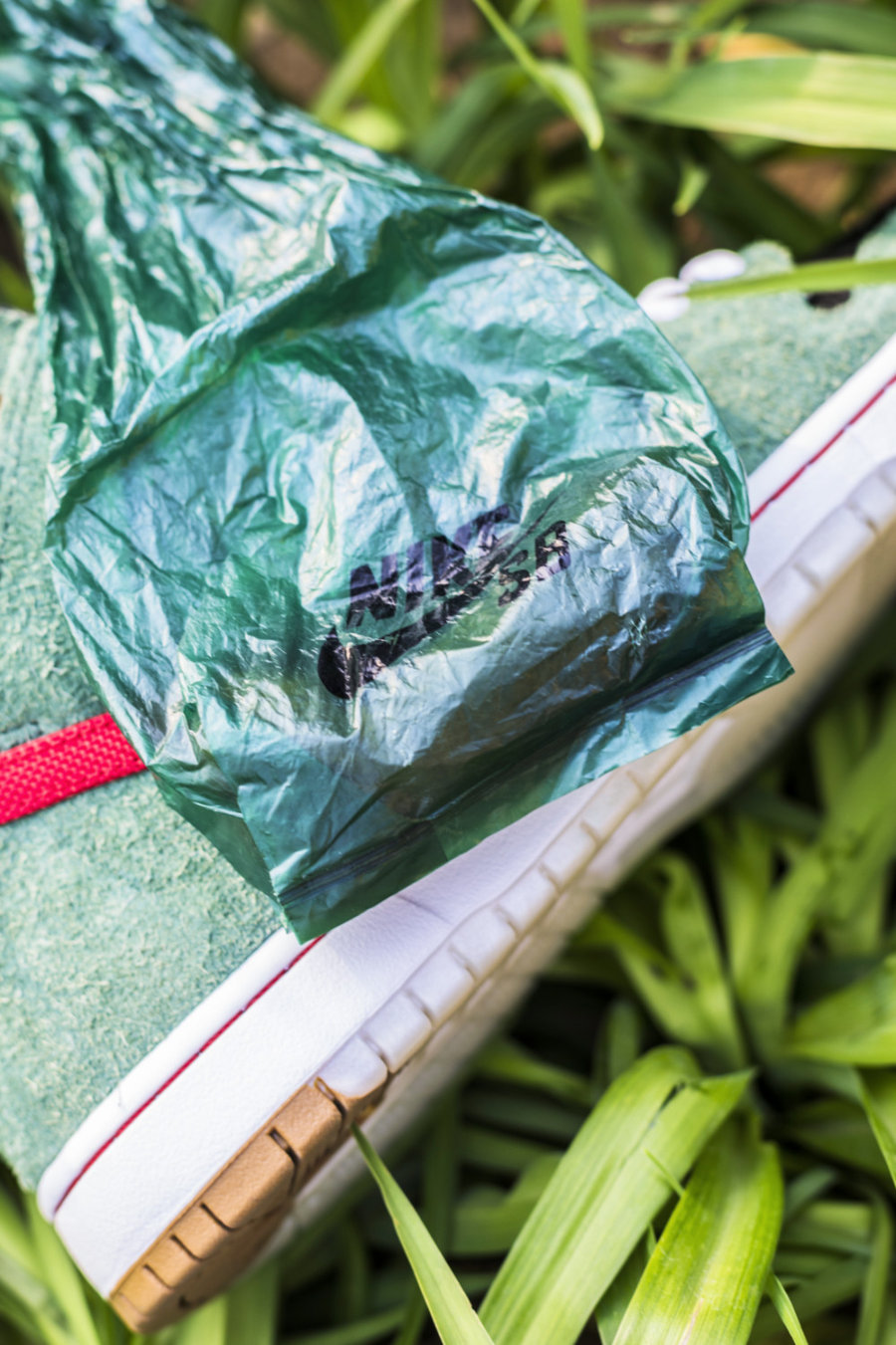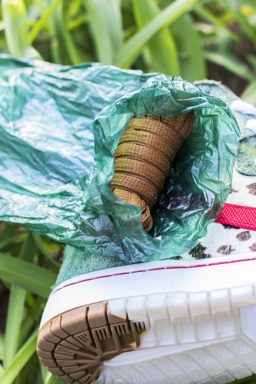 随鞋附送一个绿色 “铲屎袋”,里边还有一条未知条形物。原来是附赠的另一幅棕色鞋带。