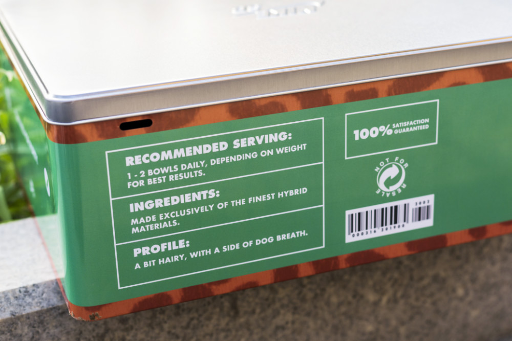 后侧的说明文字灵感恐怕来自狗粮罐头。Not For Resale 禁止转卖字样也彰显独特身份。