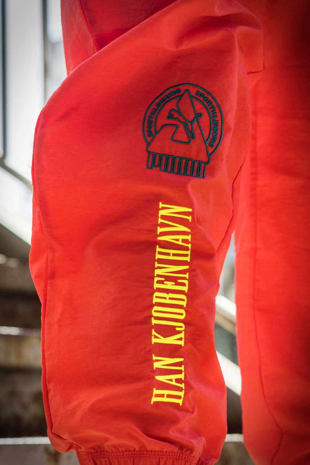 长裤则以大胆的橙红色装扮,轻薄材质适合当下季节穿着,裤腿的 Logo 及字体同样为刺绣工艺。