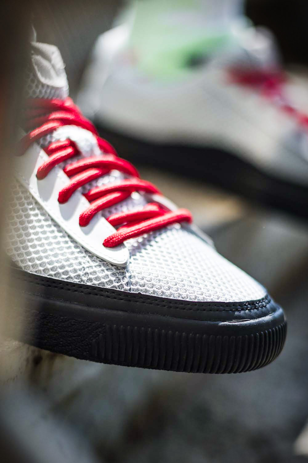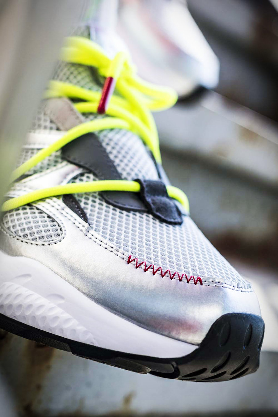 不同深浅灰色装扮,复古百搭又不失科幻,大面积金属质感银色皮料的使用让造型更加炫目夸张,让鞋款更有秀场范!