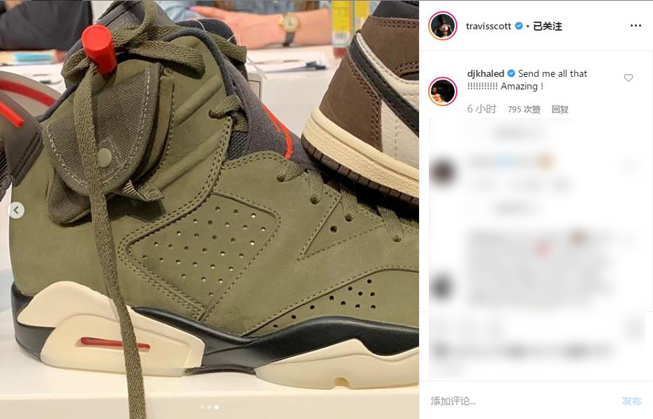 有趣的是,音乐界 “鞋王” DJ Khaled 也评论了 Travis Scott 的 Ins,表示很想要!看来这双联名 Air Jordan 6 魅力真不小。