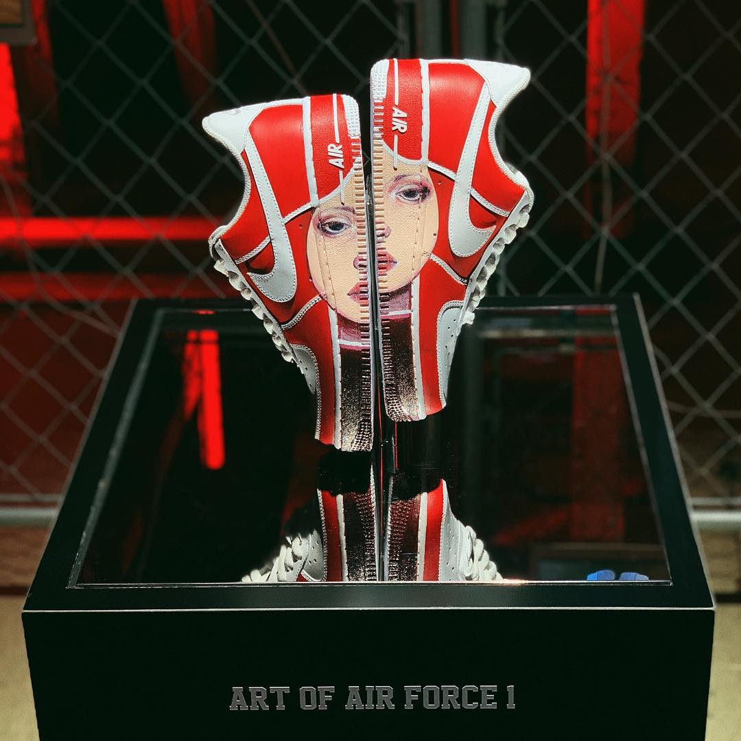 凭借着不错的绘画技巧,她还为 Nike 打造定制球鞋,下面这两双 Air Force 1 都作为展品展出。