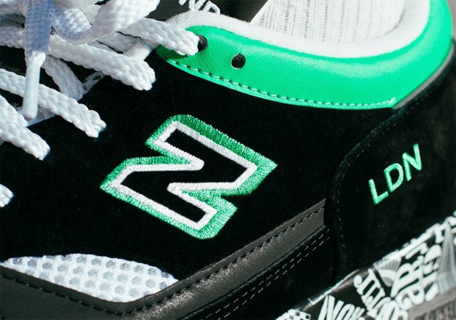 鞋侧还有绿色伦敦 LDN 字样的刺绣,中底是以黑白色文字和图案来进行涂鸦,意在表达伦敦这座城市的多样性、包容性。