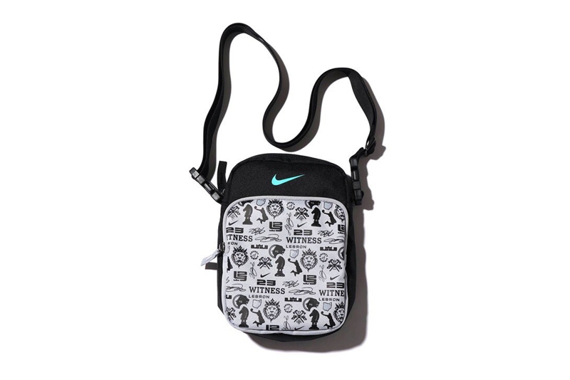 鞋身到后跟都有丰富的浮雕纹理,展现了诸多 LeBron James 的相关图形元素,除了鞋款之外,这次合作还带来了同样以勒布朗为元素的挎包。