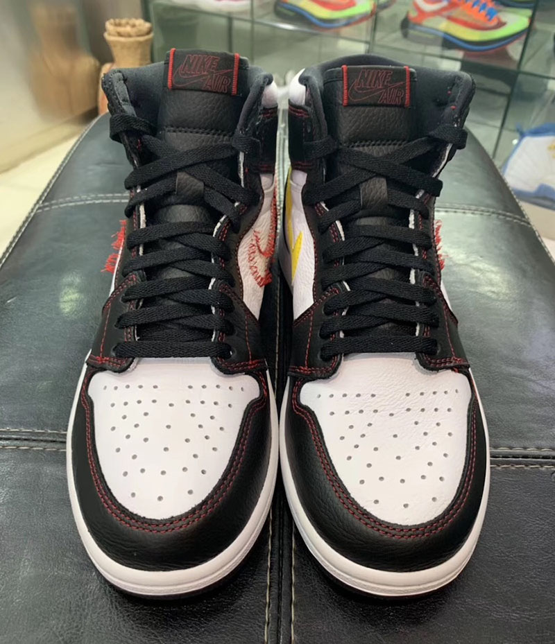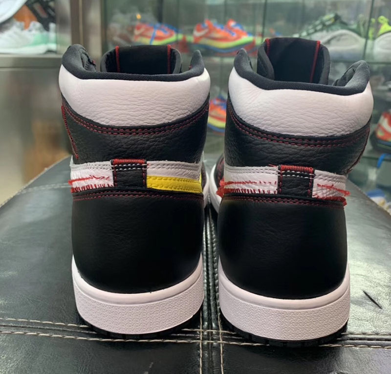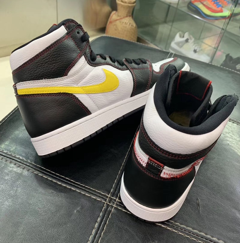 眼前这双 Air Jordan 1 “Dynamic Yellow” 主体以简约的黑白撞色示人,最大亮点在于仅有左脚内侧缝上了黄色 Swoosh,其他几个 Swoosh 的位置都空空如也,似乎是被拆掉了一样,仅留下红色线头勾勒出 Swoosh 的轮廓。